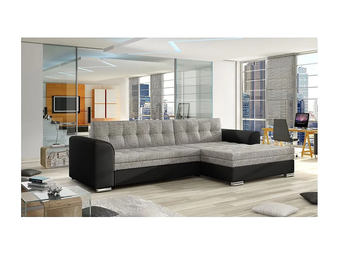 Sofá esquinero convertible KAPONA en tela y piel sintética - Patas de acero cromado-Negro/gris jaspeado-Ángulos rectos