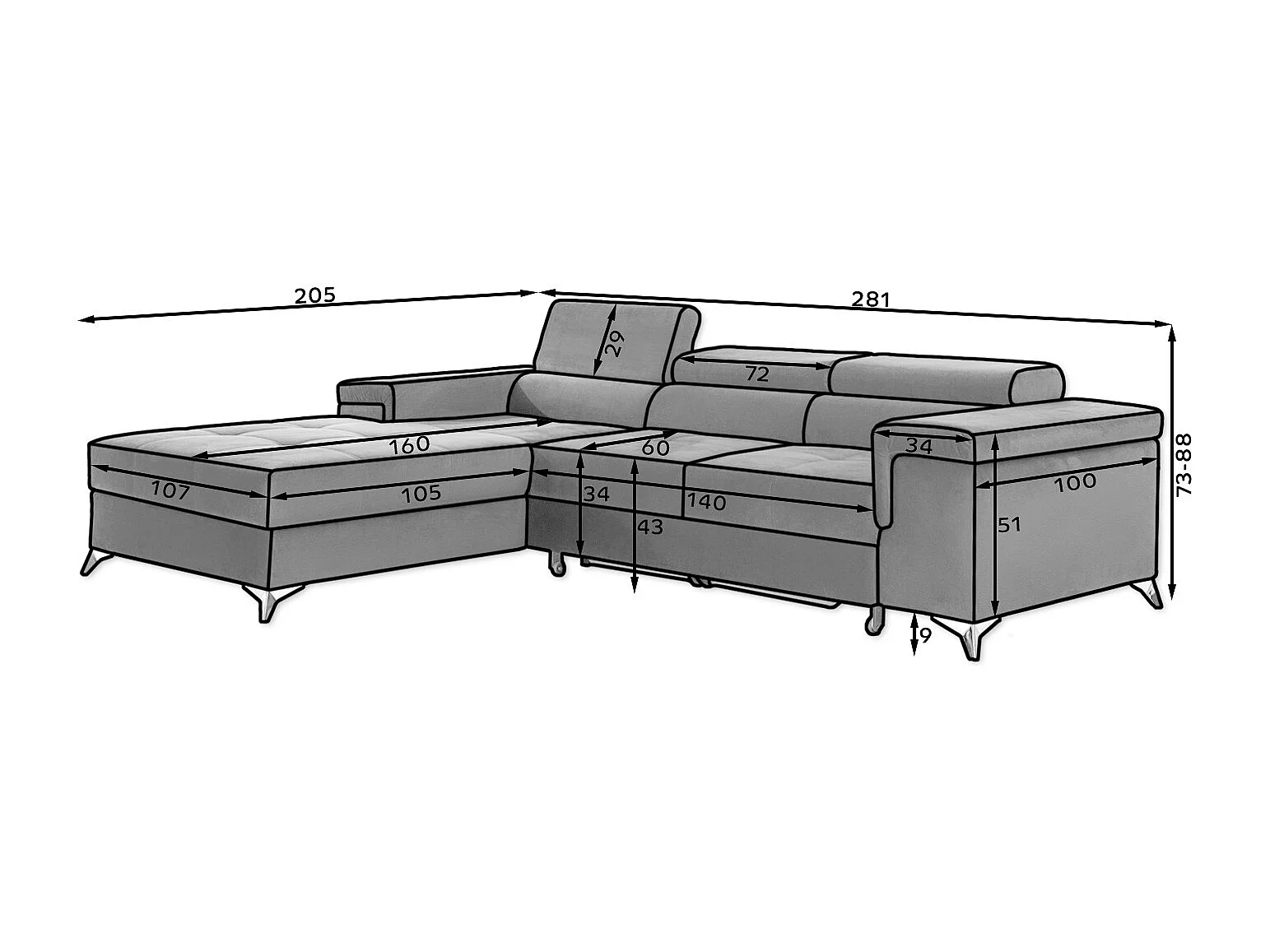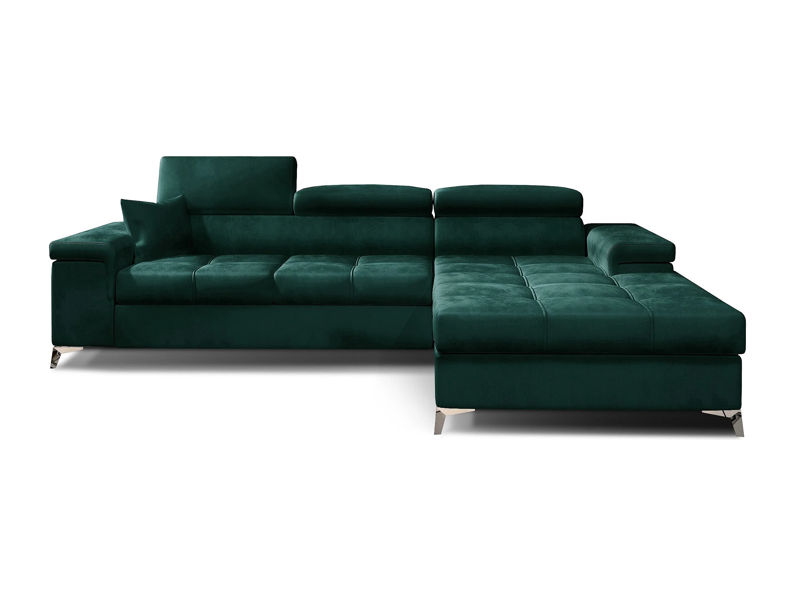 Sofá esquinero convertible RIKARO de terciopelo con reposacabezas ajustables - Base y patas de acero cromado-Azul oscuro-Ángulos rectos