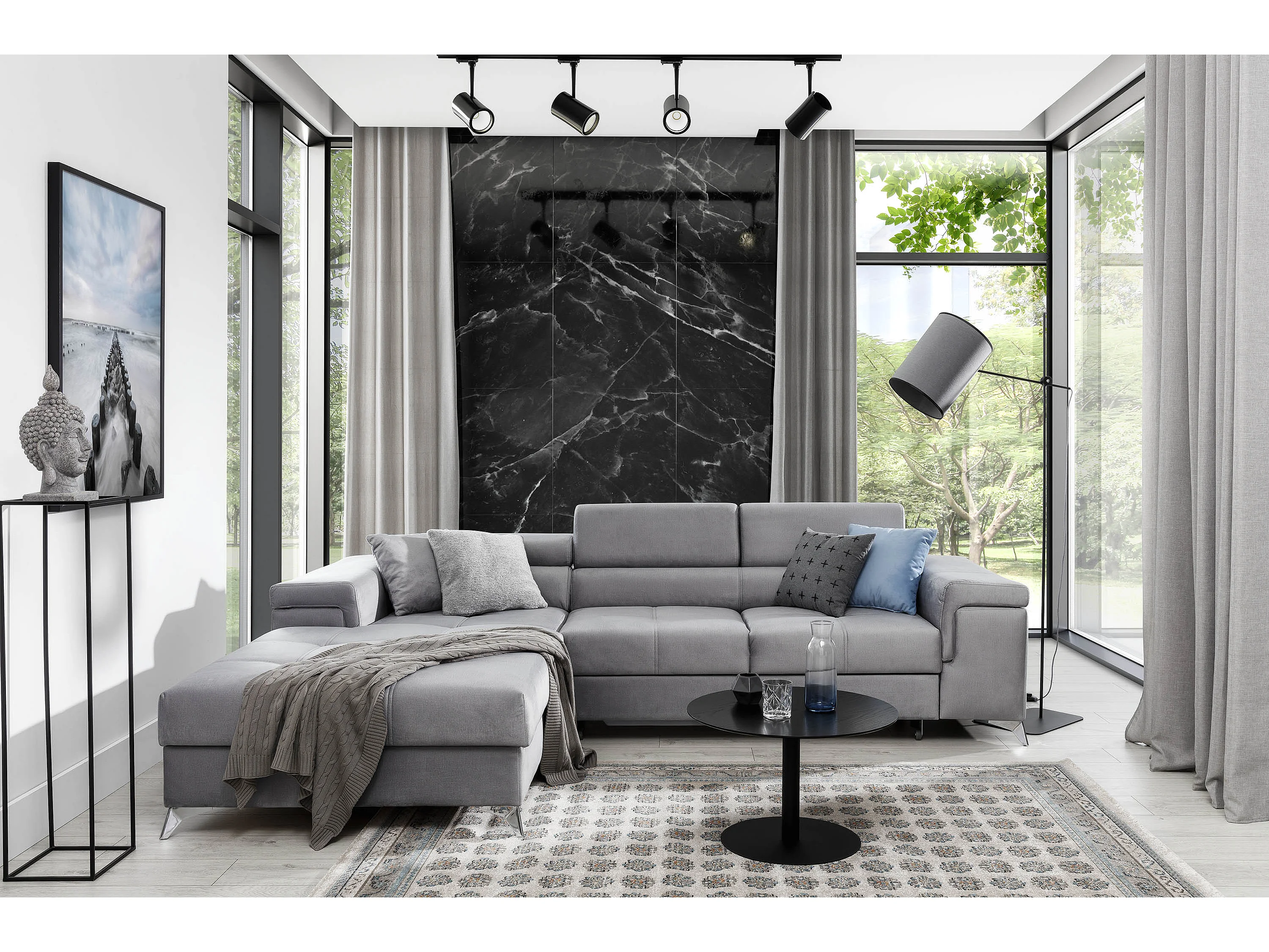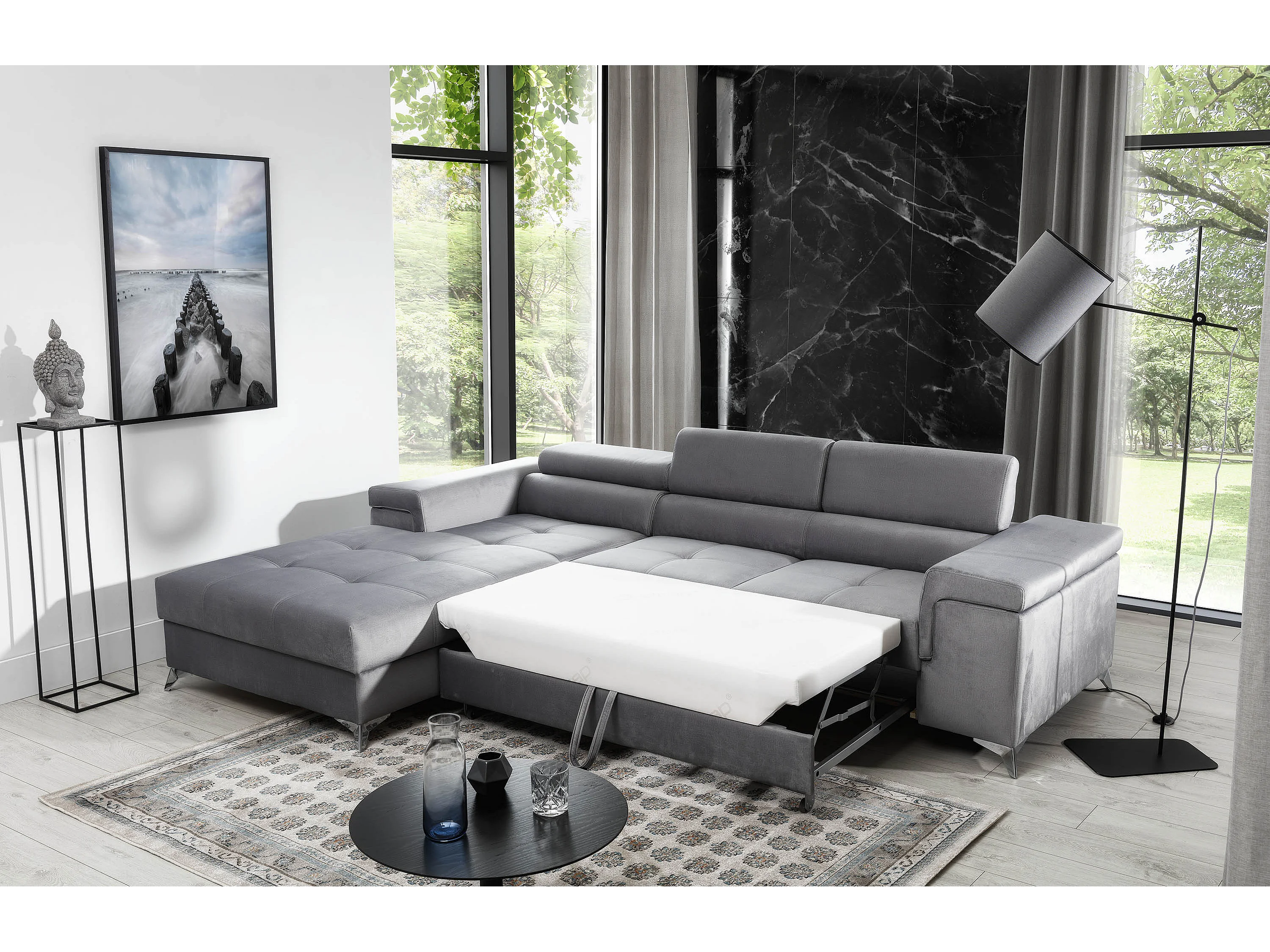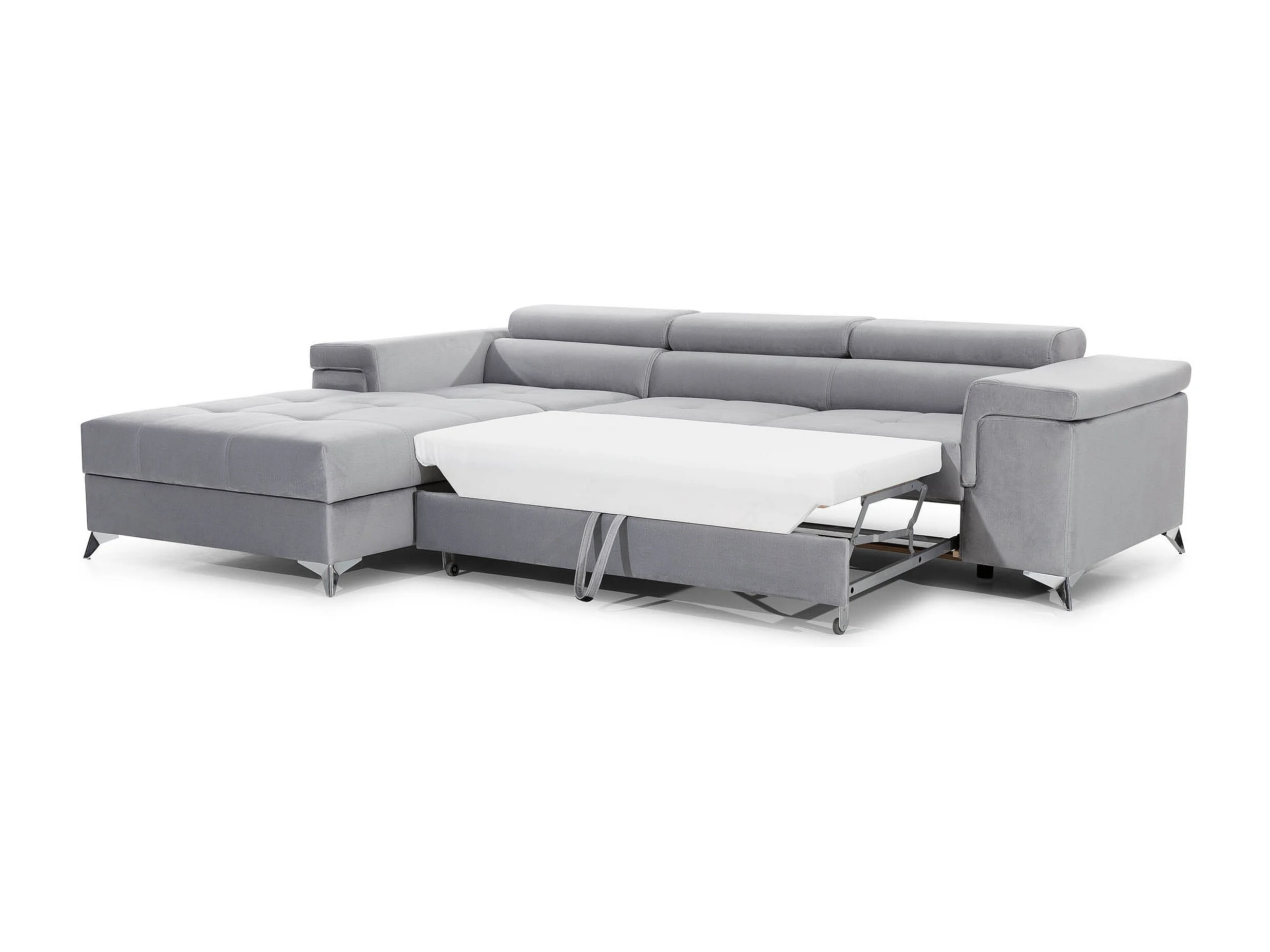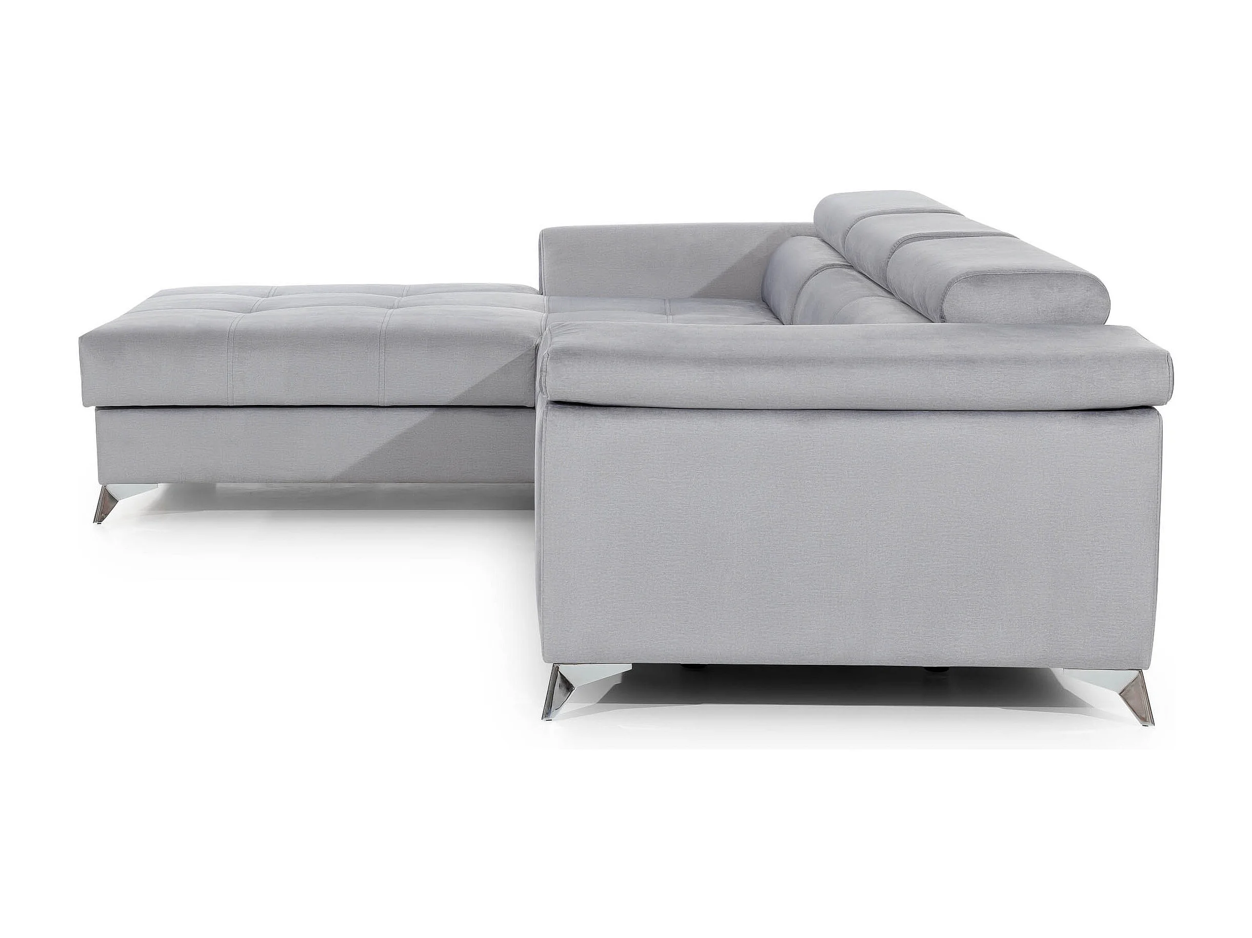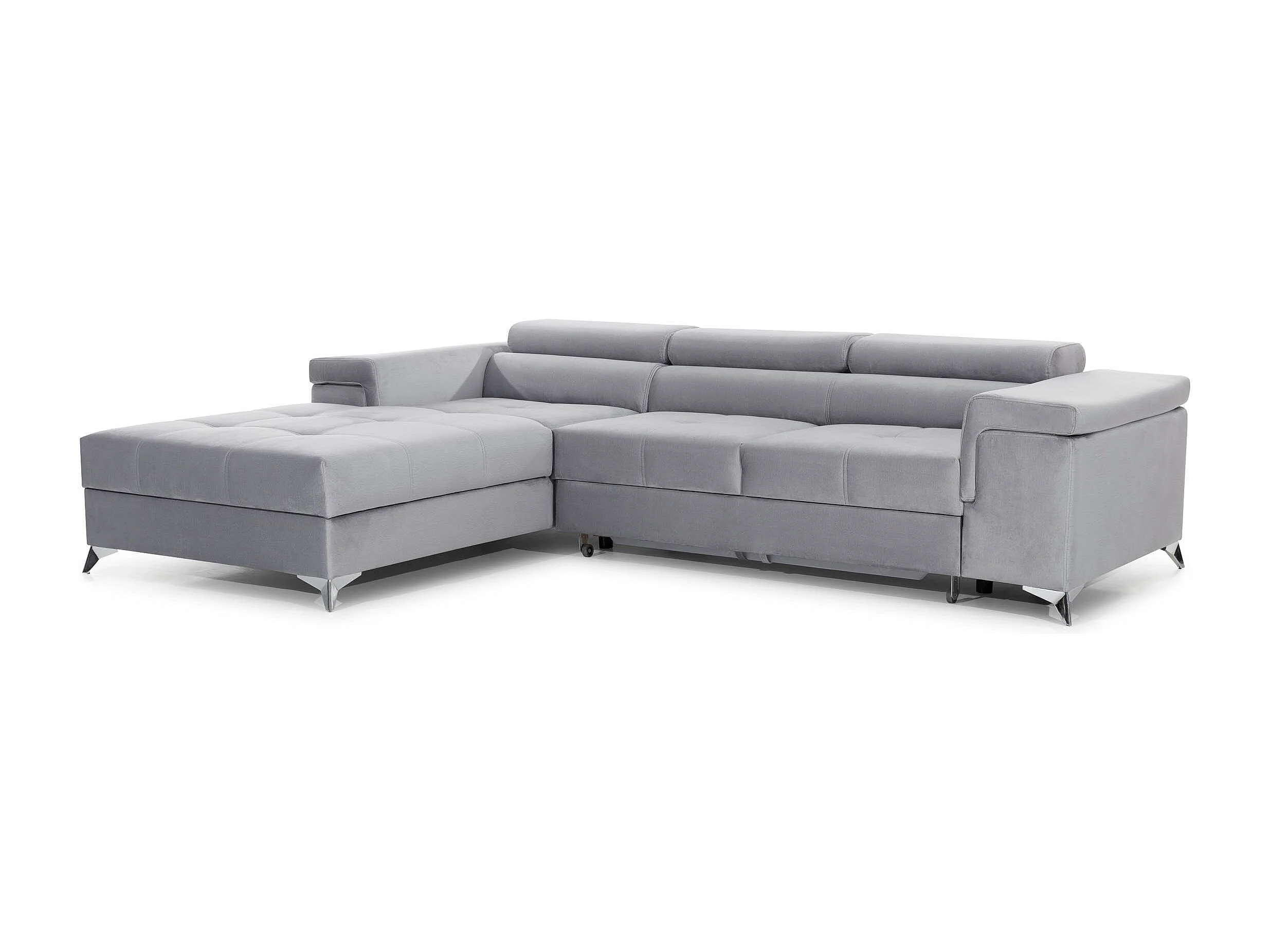 Sofá esquinero convertible RIKARO de terciopelo con reposacabezas ajustables - Base y patas de acero cromado-Gris claro-Ángulo izquierdo