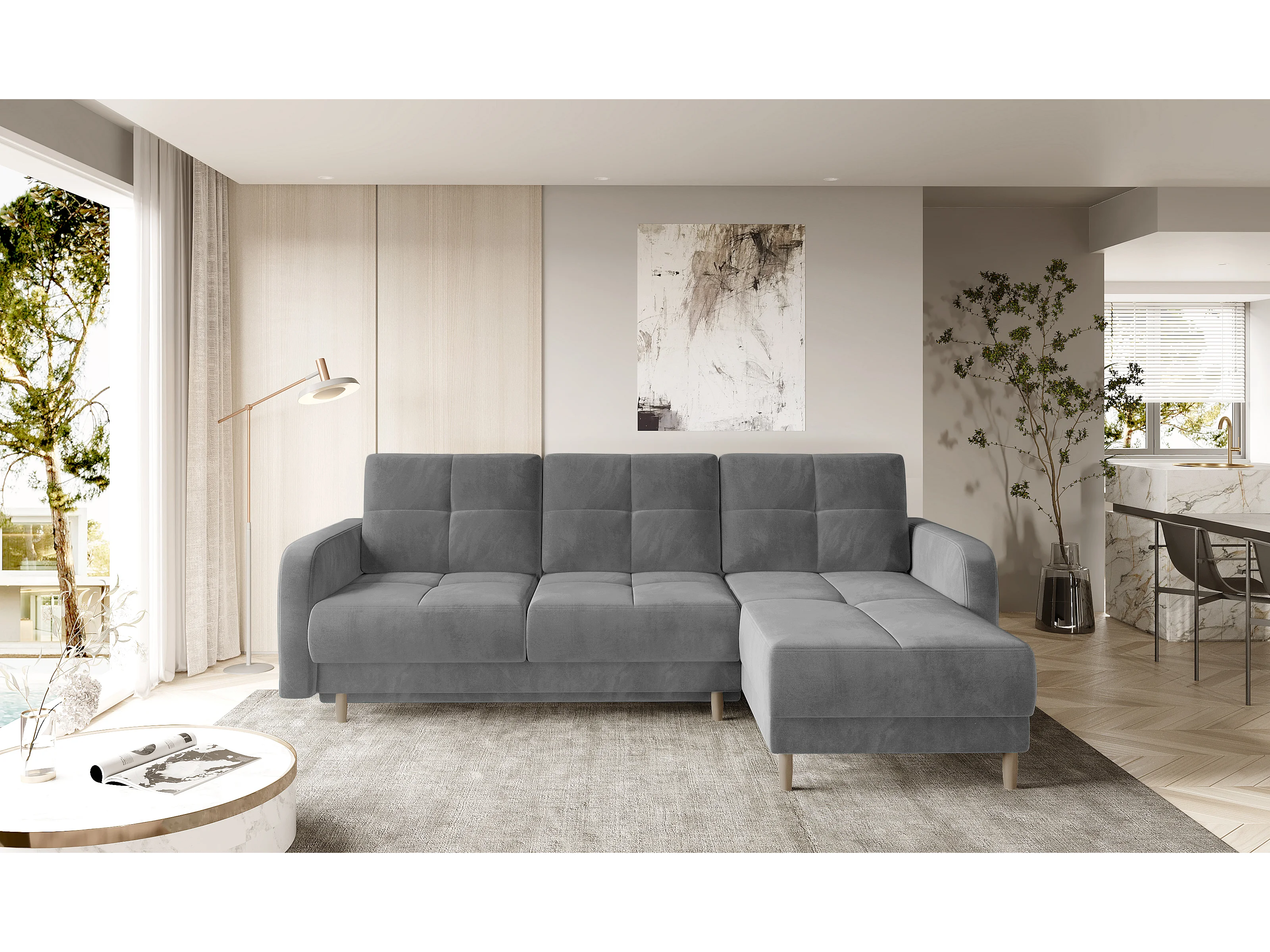 Sofá esquinero convertible y reversible de tela KINDO - Patas de madera clara-Color Gris