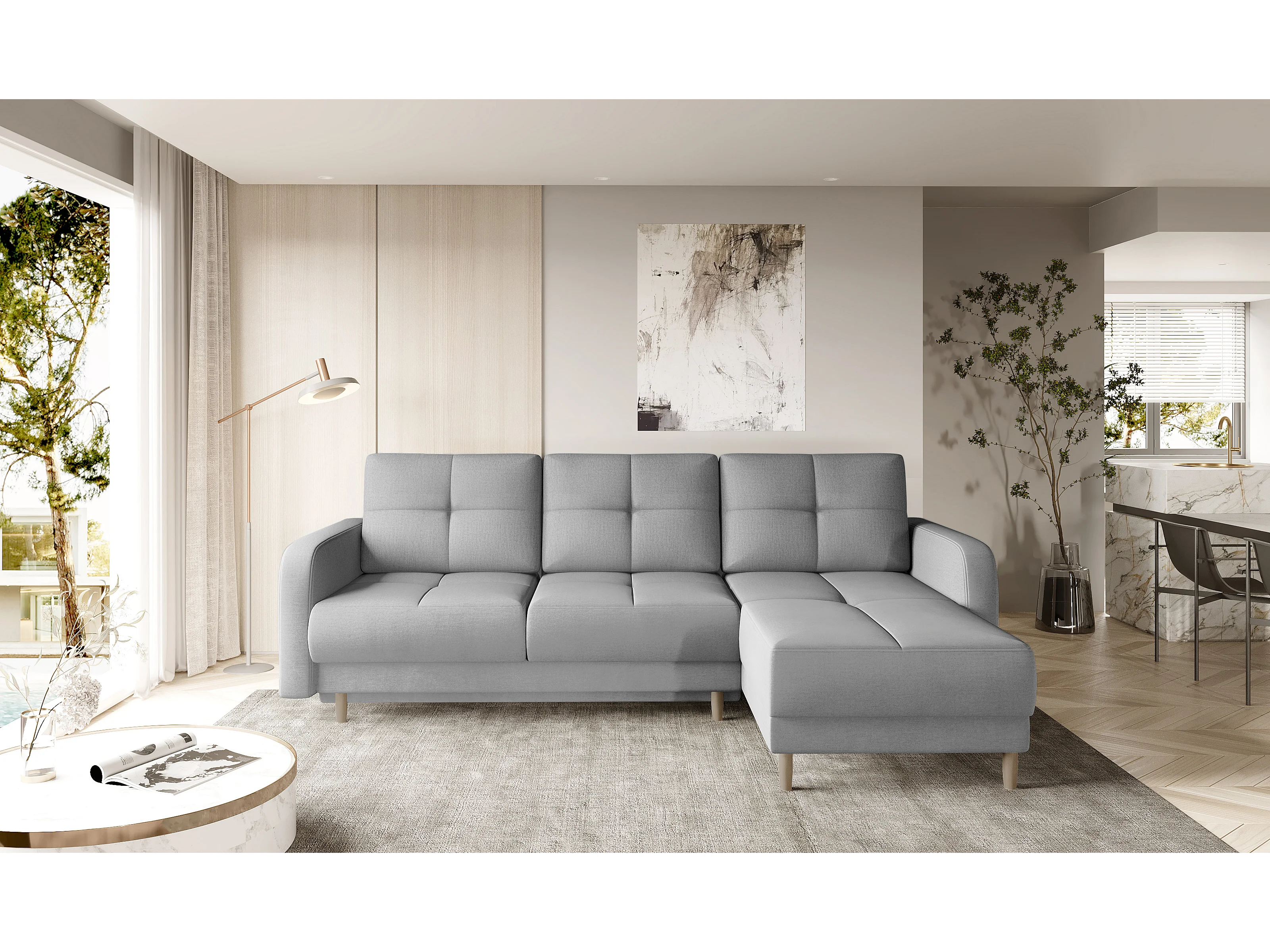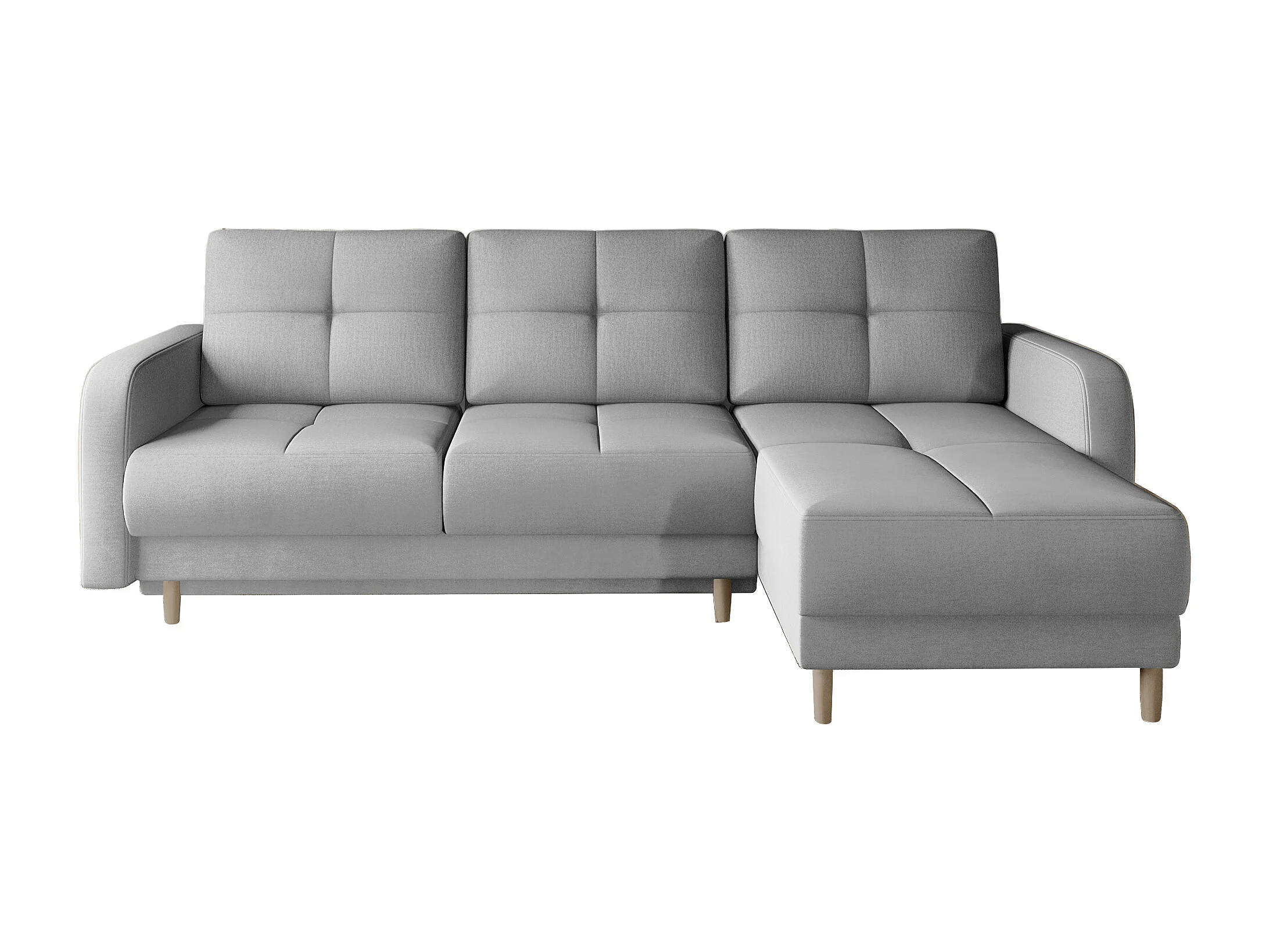 Sofá esquinero convertible y reversible de tela KINDO - Patas de madera clara-Color Gris cemento