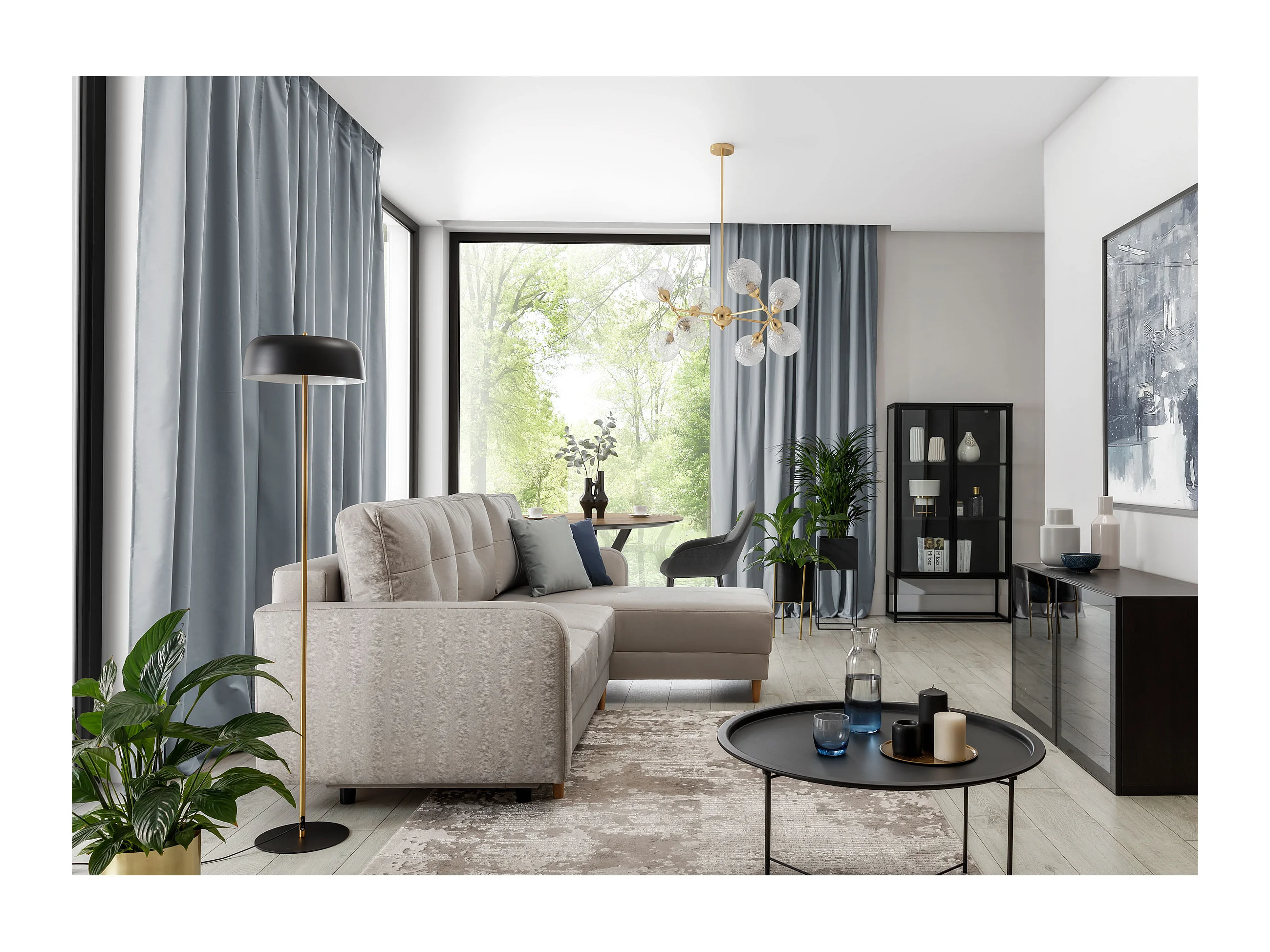 Sofá esquinero convertible y reversible de tela KINDO - Patas de madera clara-Color Negro