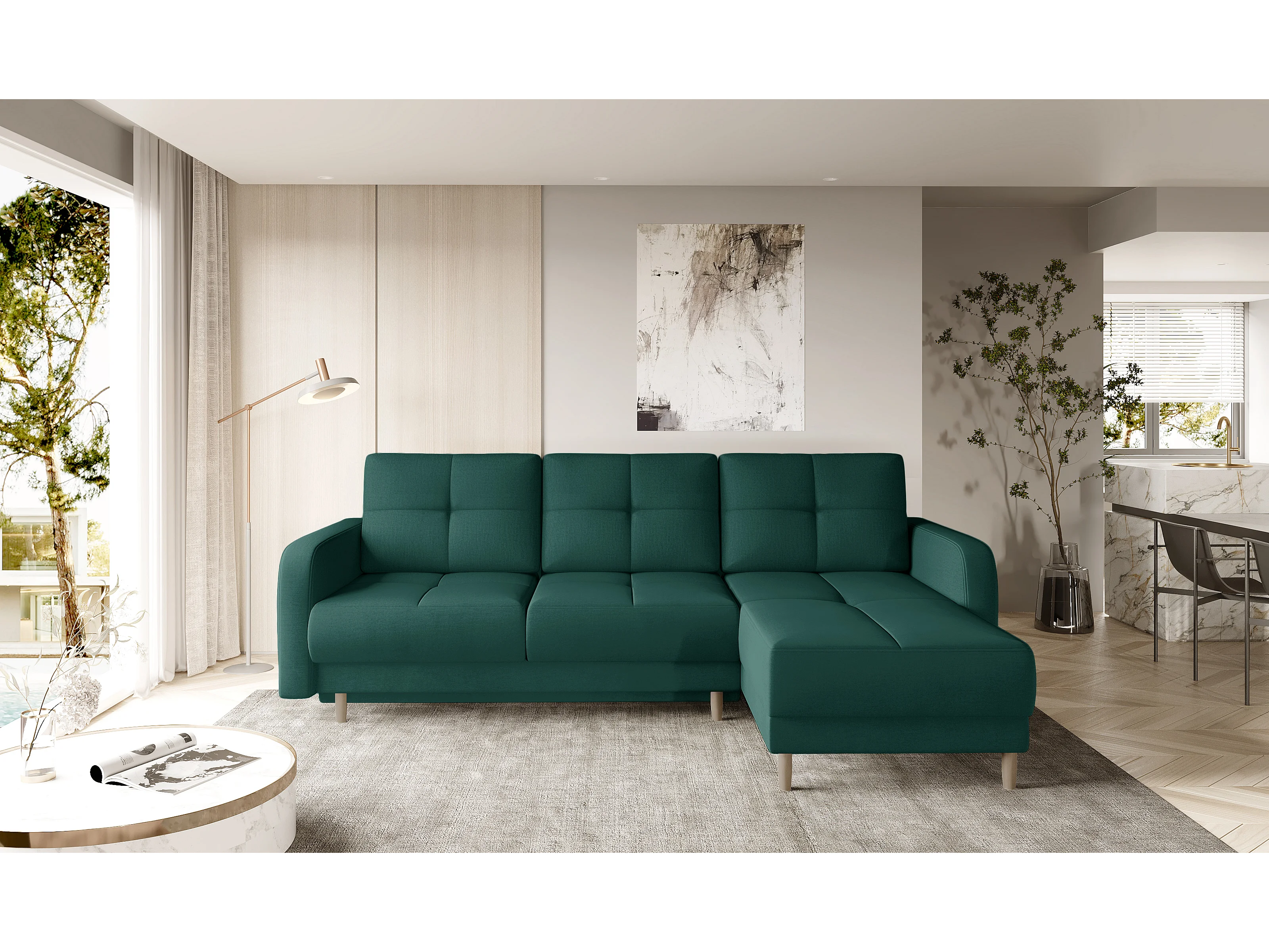 Sofá esquinero convertible y reversible de tela KINDO - Patas de madera clara-Color Verde