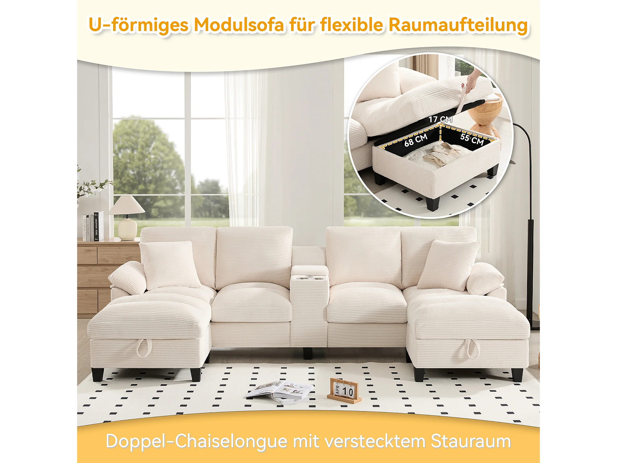 Sofá esquinero de 4 plazas en forma de U con almacenaje, portavasos y puertos USB - 293 x 142 x 93 cm - Terciopelo - beige