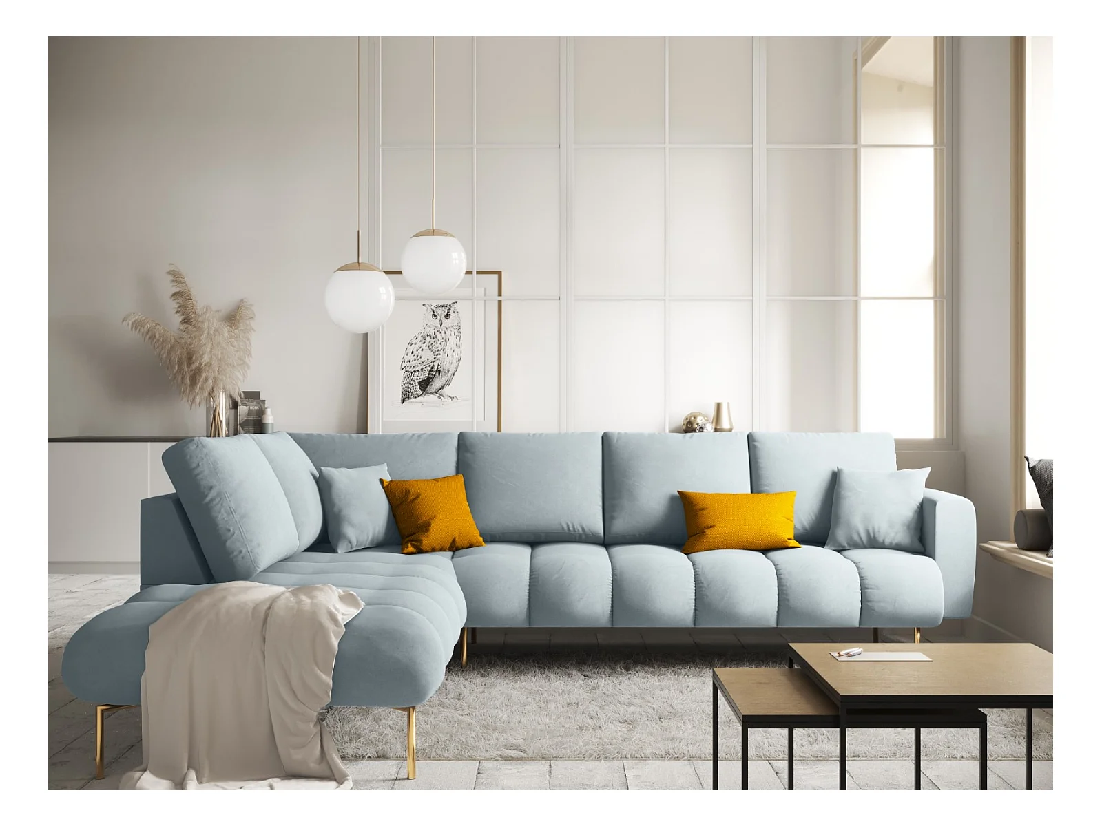 Cosmopolitan Design - Sofá esquinero izquierdo "Hastings" 5 plazas de terciopelo azul claro - 301x216x75cm