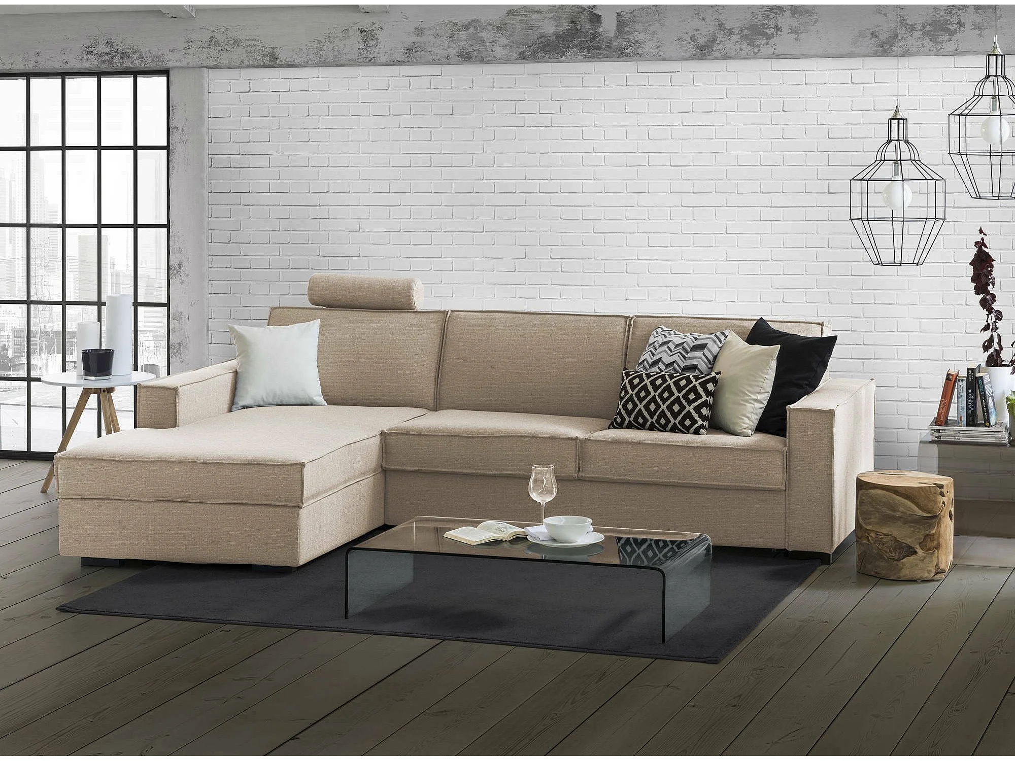 Sofá fijo Dlovis, Sofá de esquina, 100% Made in Italy, Sofá Salón con, península de contenedores Izquierda, con reposabrazos delgados, Cm 260x95h90, Beige