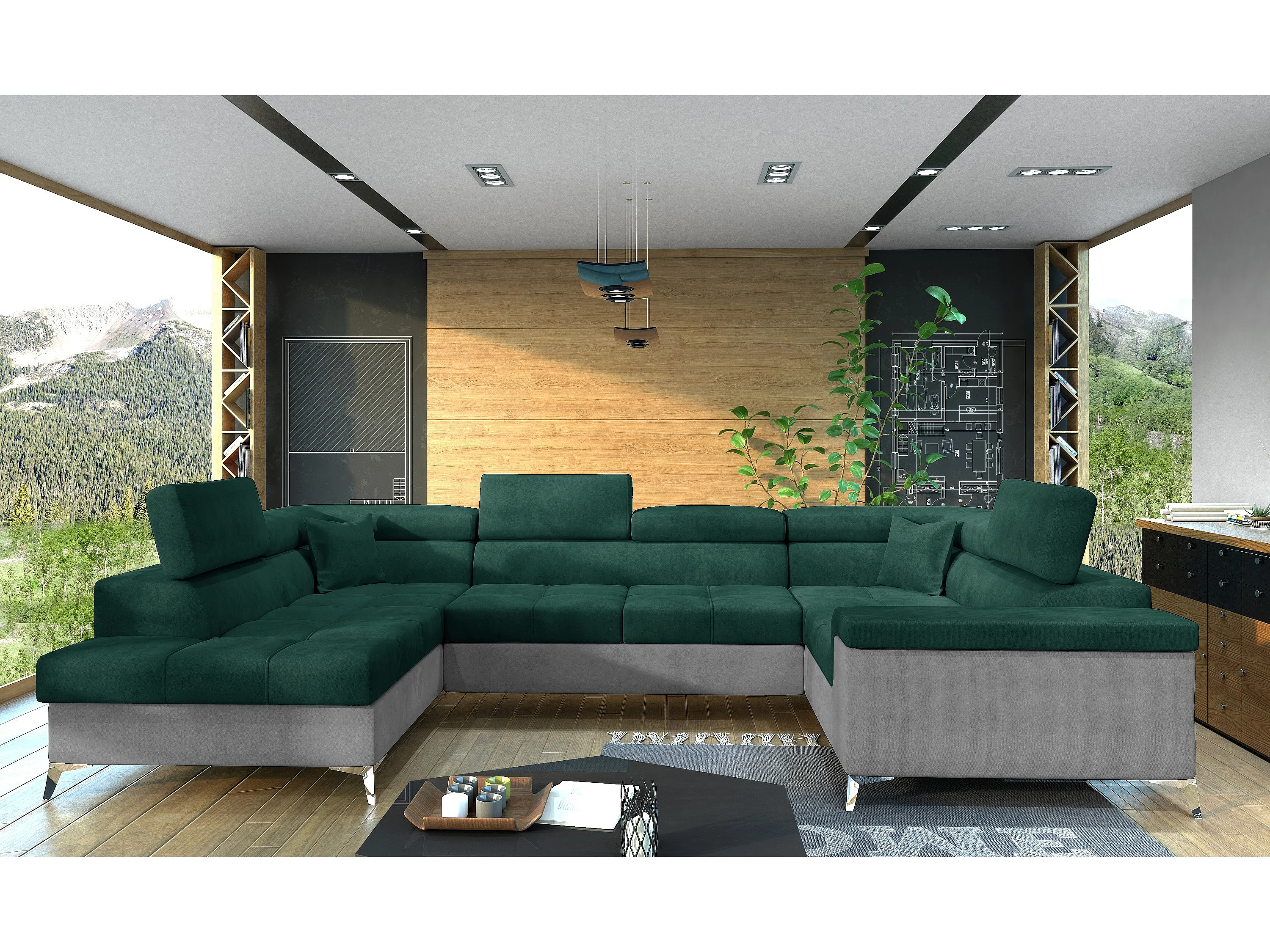 Sofá panorámico convertible TRIANO en terciopelo, con almacenaje y reposacabezas ajustables-Gris claro/Verde-Caja Lado izquierdo