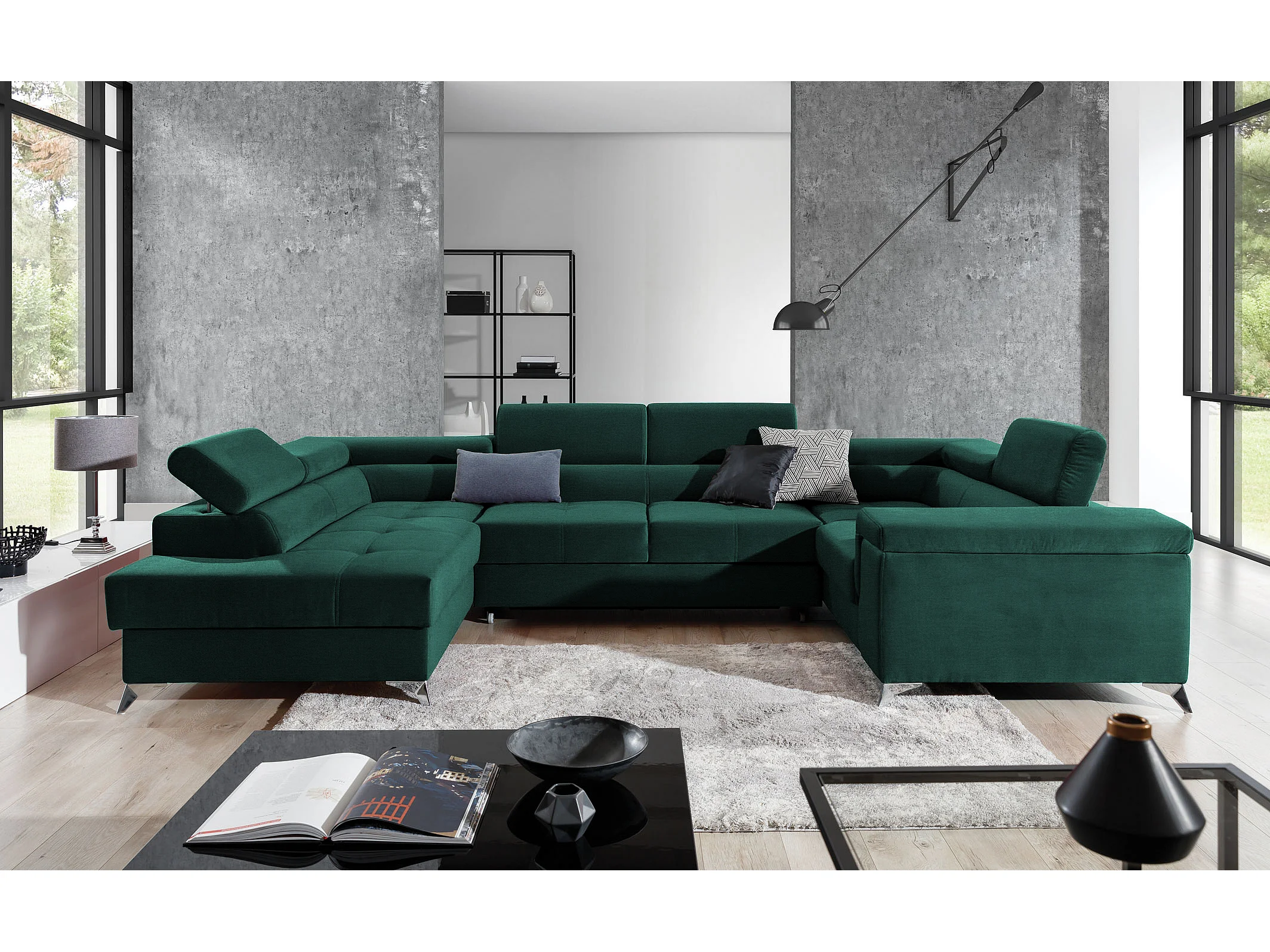 Sofá panorámico convertible TRIANO en terciopelo, con almacenaje y reposacabezas ajustables-Verde-Caja Lado izquierdo