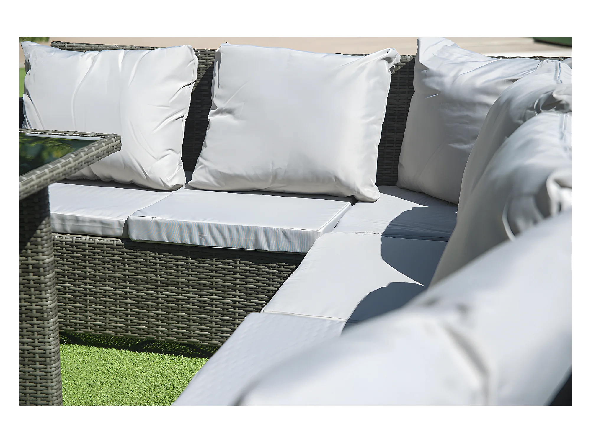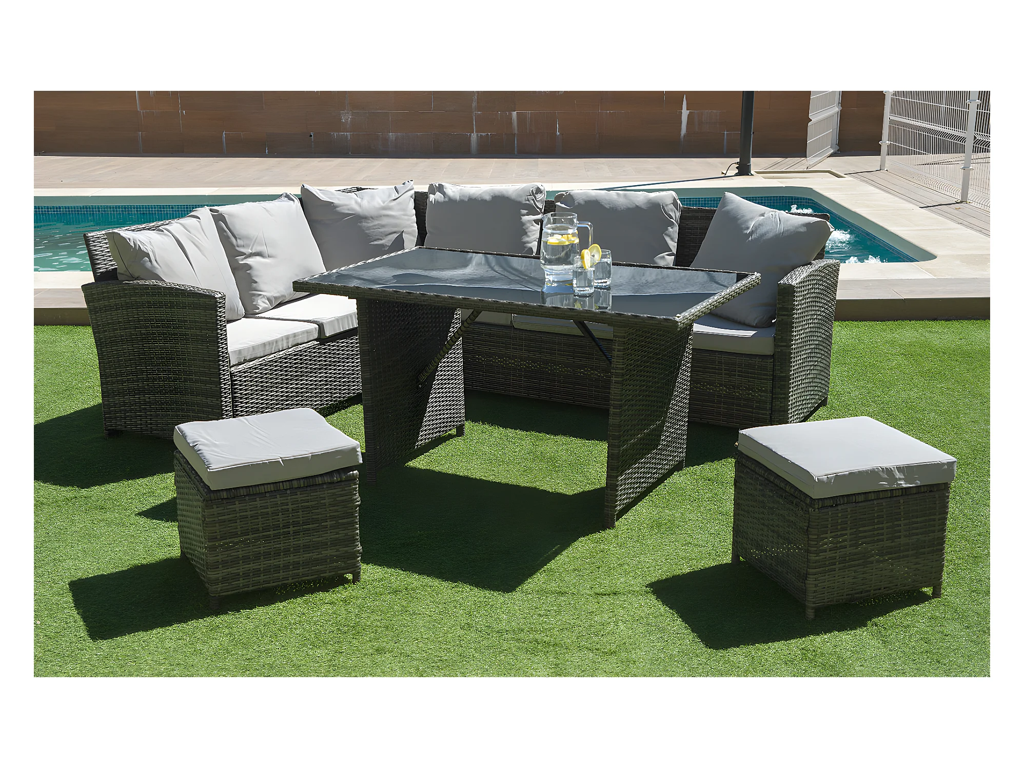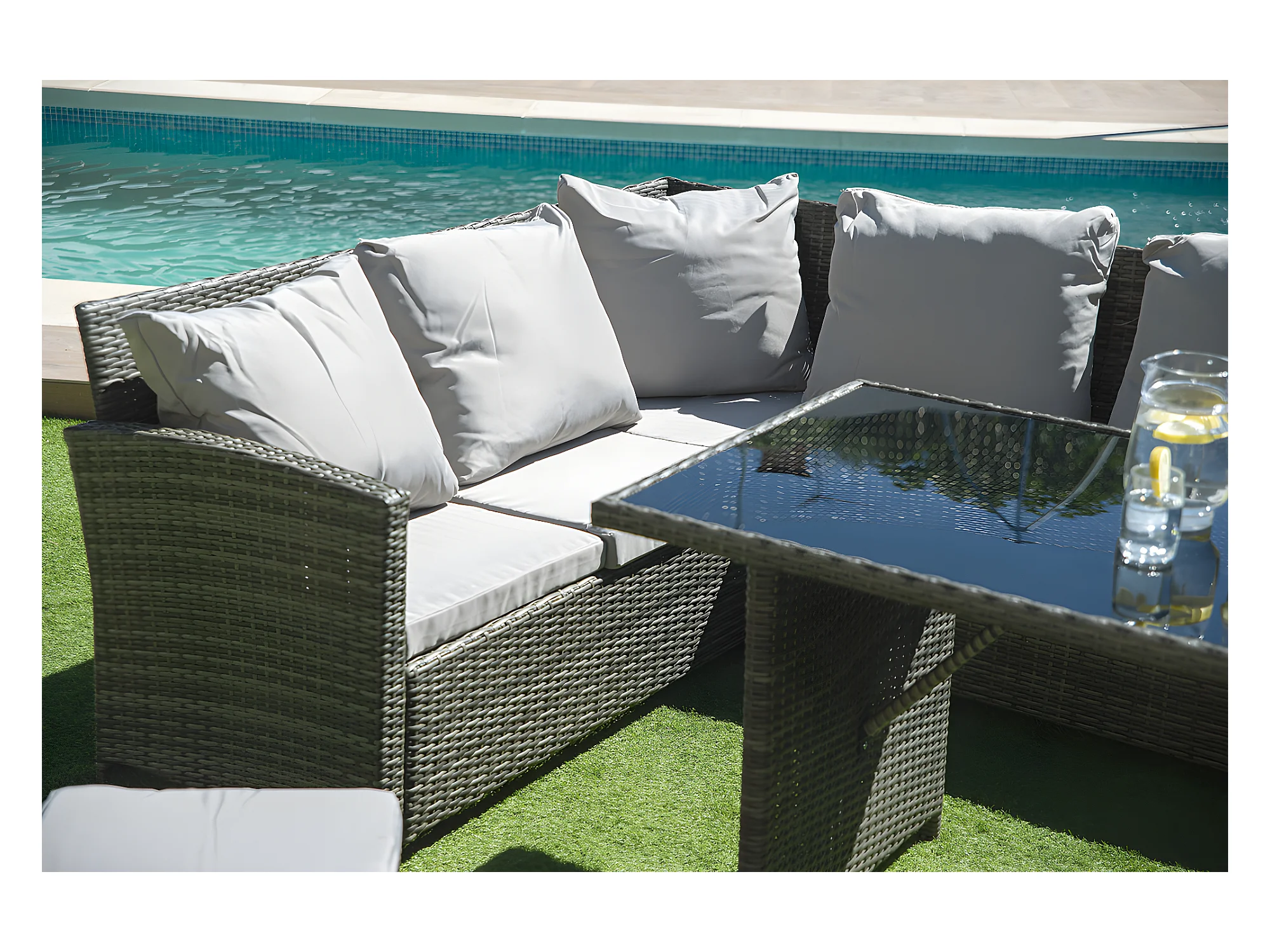 Sofá de jardín en forma de L con mesa y cojines ratán PE marrón