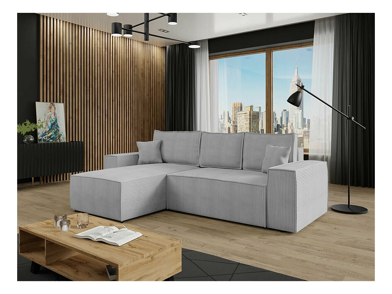 Sofá rinconero Clovis 108, Gris, Función de descanso, Almacenaje, 279x174x94cm