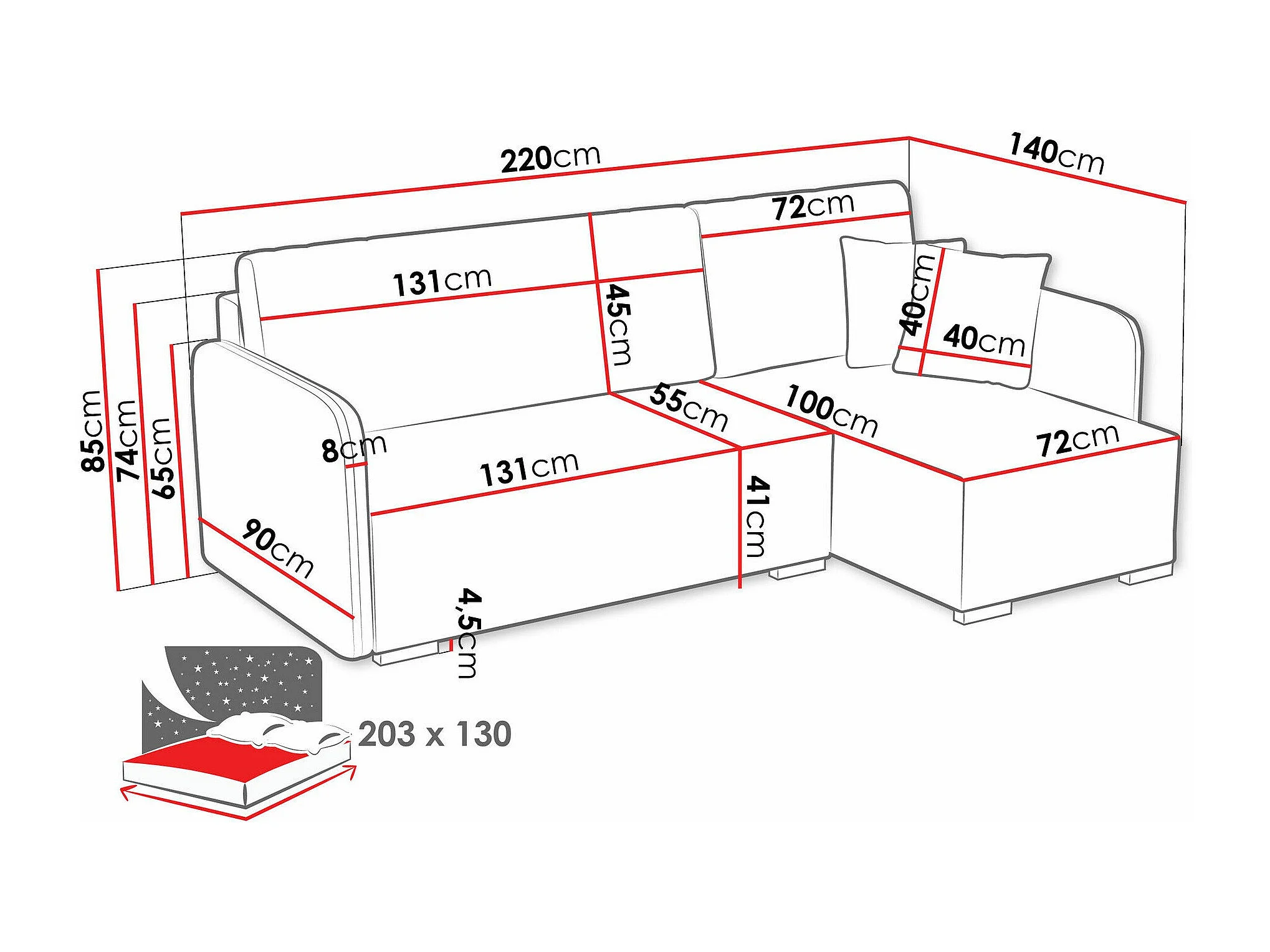 Sofá rinconero Columbus 245, Negro, Función de descanso, Almacenaje, 220x140x85cm