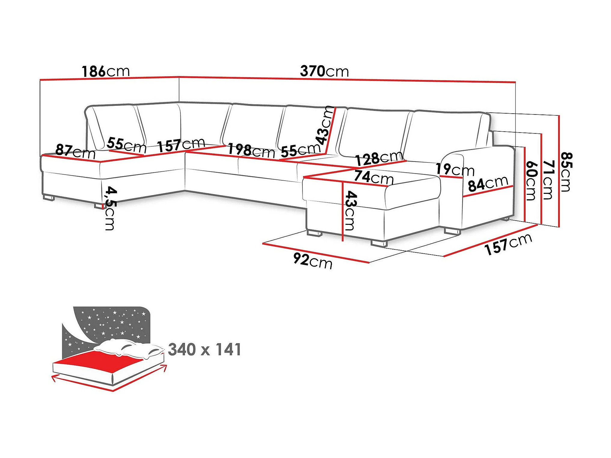 Sofá rinconero Comfivo 191, Blanco, Función de descanso, Almacenaje, 370x186x85cm