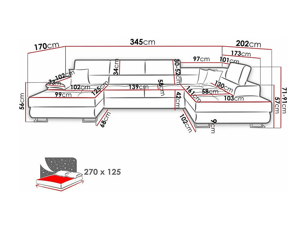 Sofá rinconero Comfivo 138, Azul, Función de descanso, Almacenaje, 345x202x71cm
