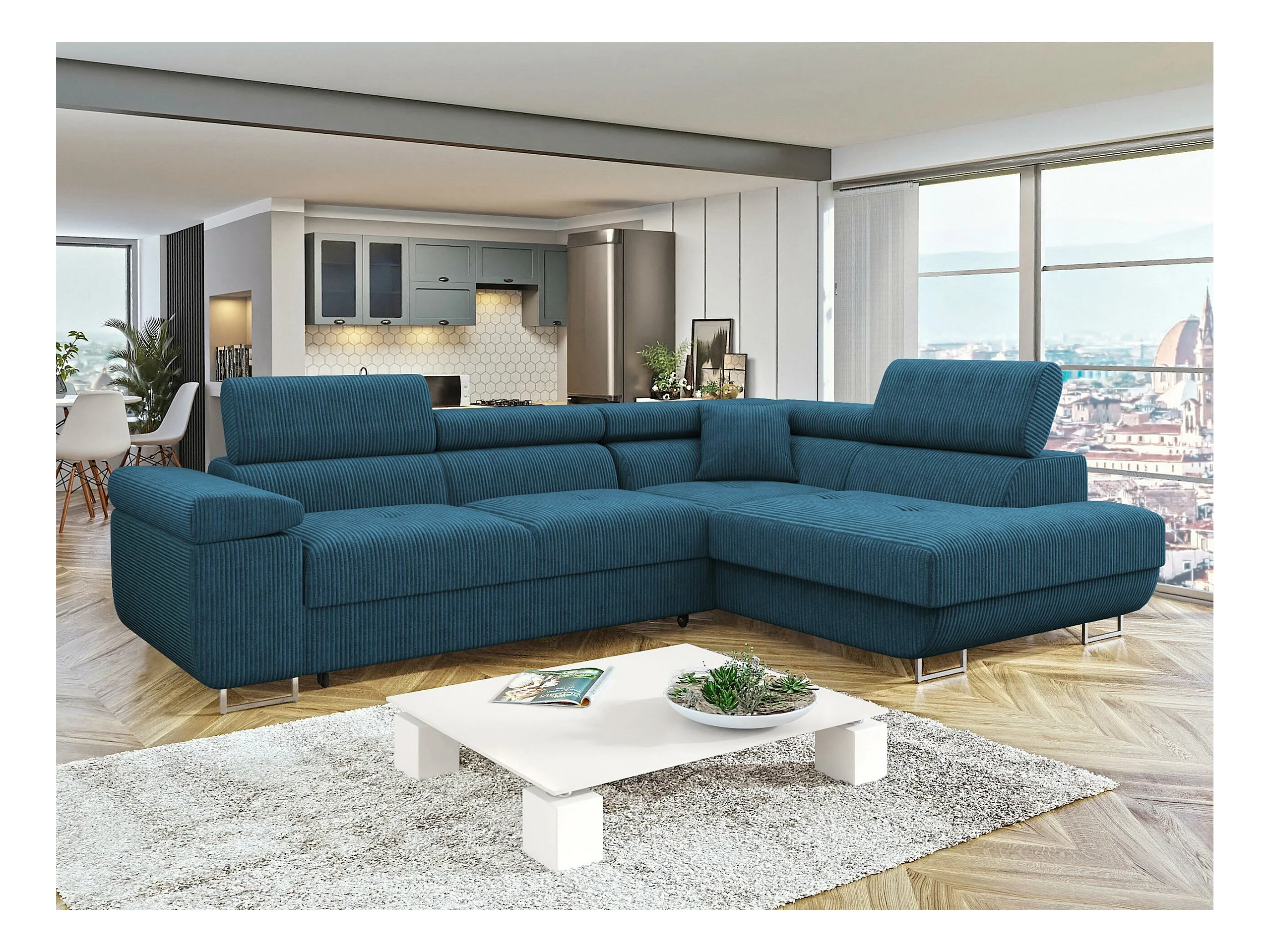 Sofá rinconero Comfivo Eliferu 100, Azul, Función de descanso, Almacenaje, 274x203x70cm