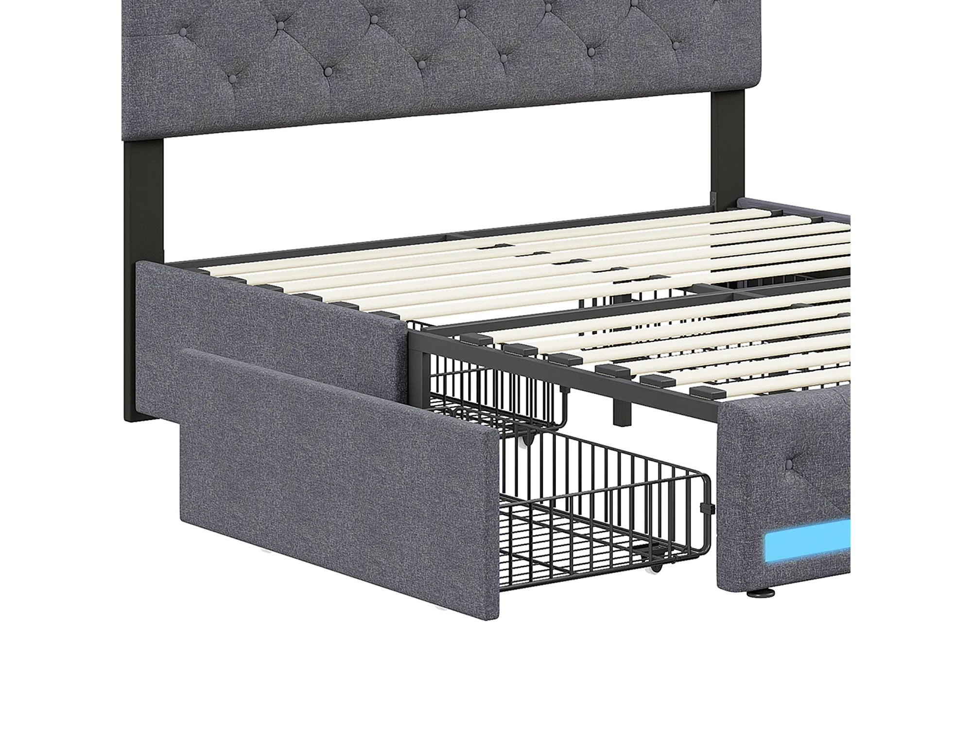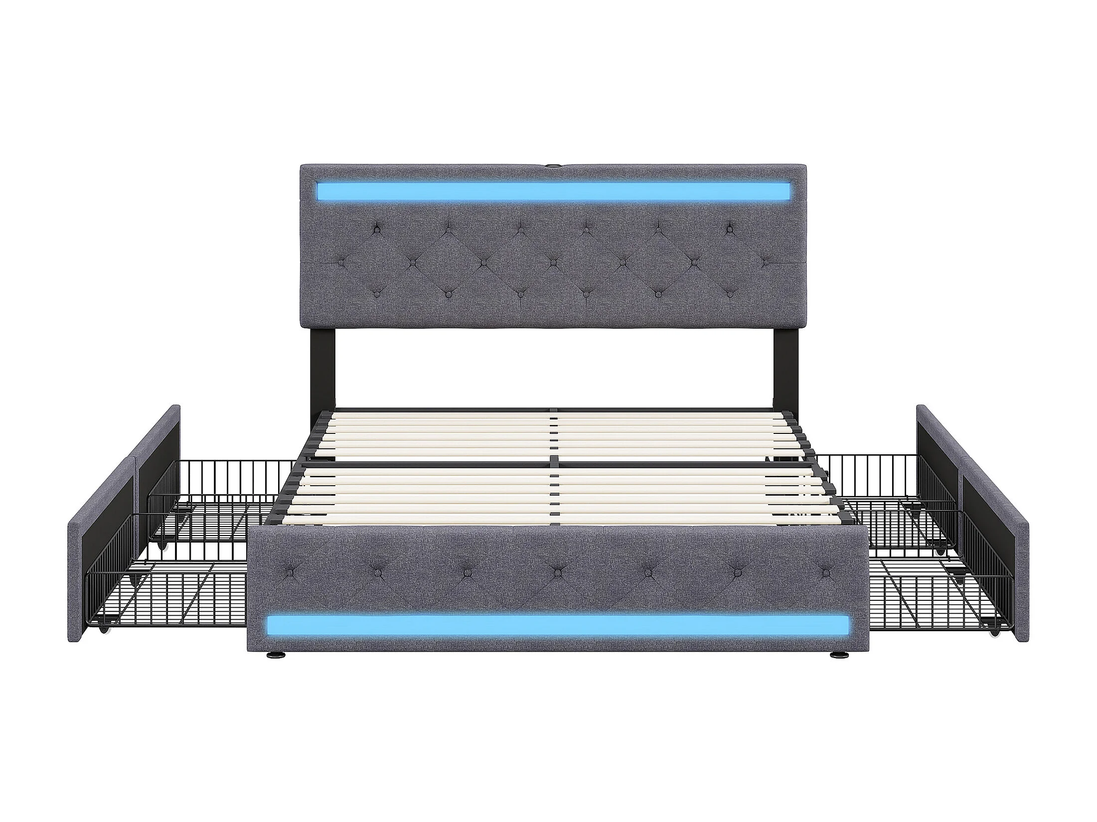 Somier de 140x190 con LED y USB, cama de matrimonio de lino con cabecero y pie de cama LED, 4 cajones metálicos, color gris