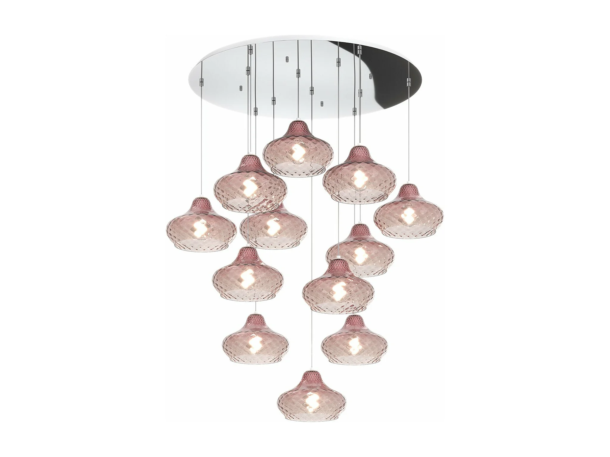 Sospensione Cromo 12 Luci Tonda Vetri Piccoli Rubino
