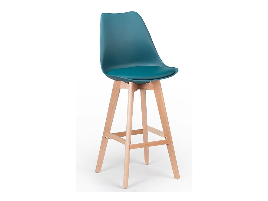 Taburete alto nórdico con cojín de piel sintética azul pato y patas de haya clara Tula 76 cm