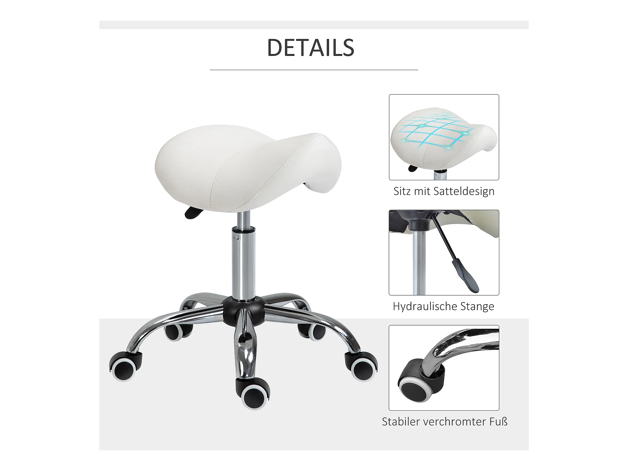 Taburete con ruedas regulable, asiento ergonómico acolchado, metal, blanco (52x53x49 cm)