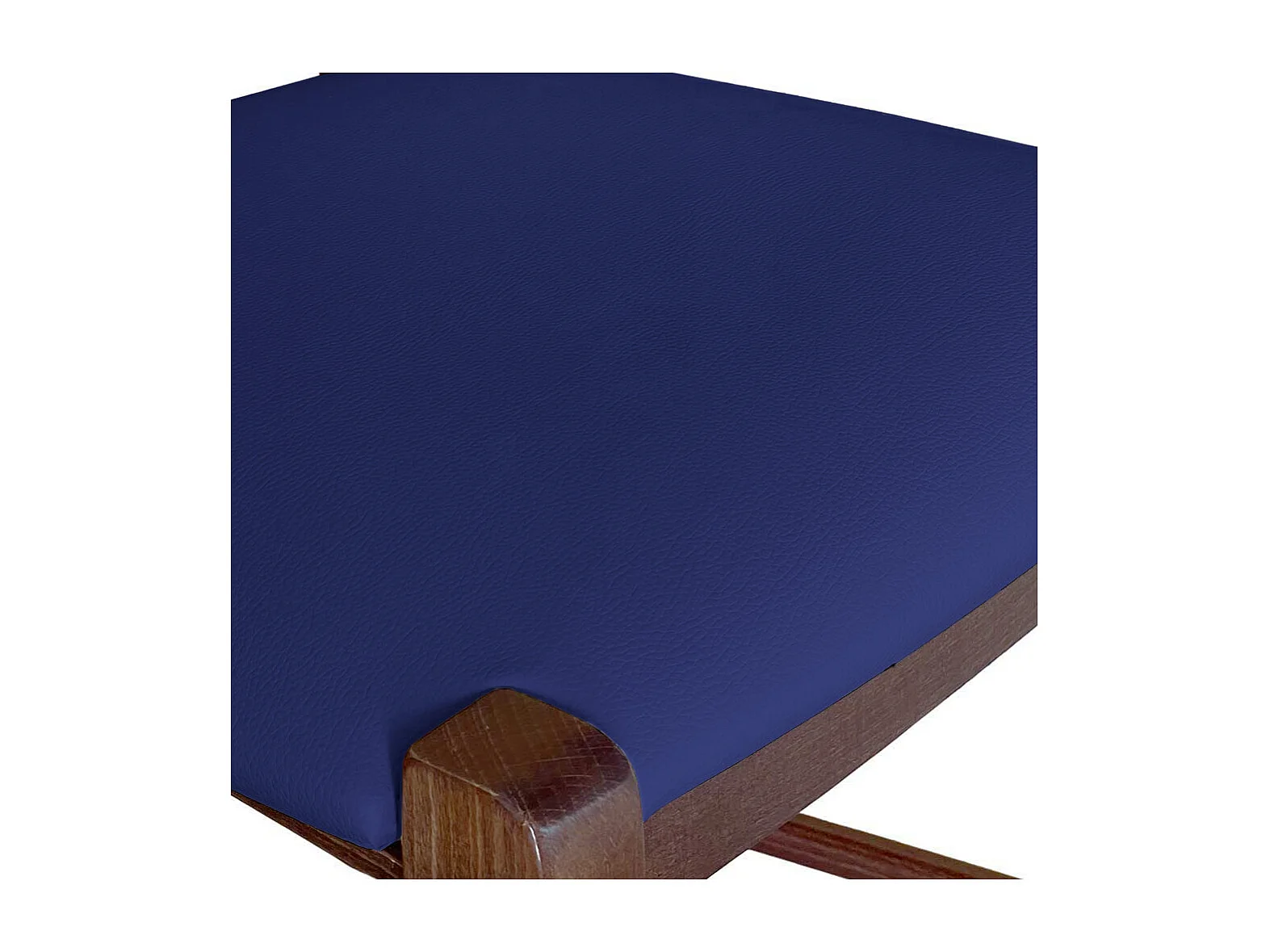 Taburete de bar de 80 cm en nogal oscuro con asa y asiento acolchado en piel sintética azul.