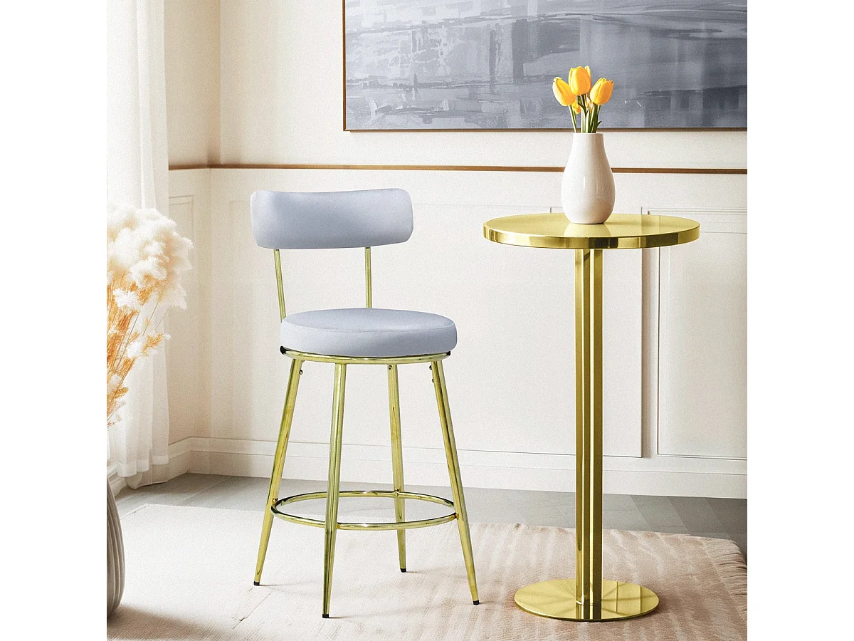 Taburete de bar y cocina de terciopelo con respaldo y patas doradas Kraven - Gris