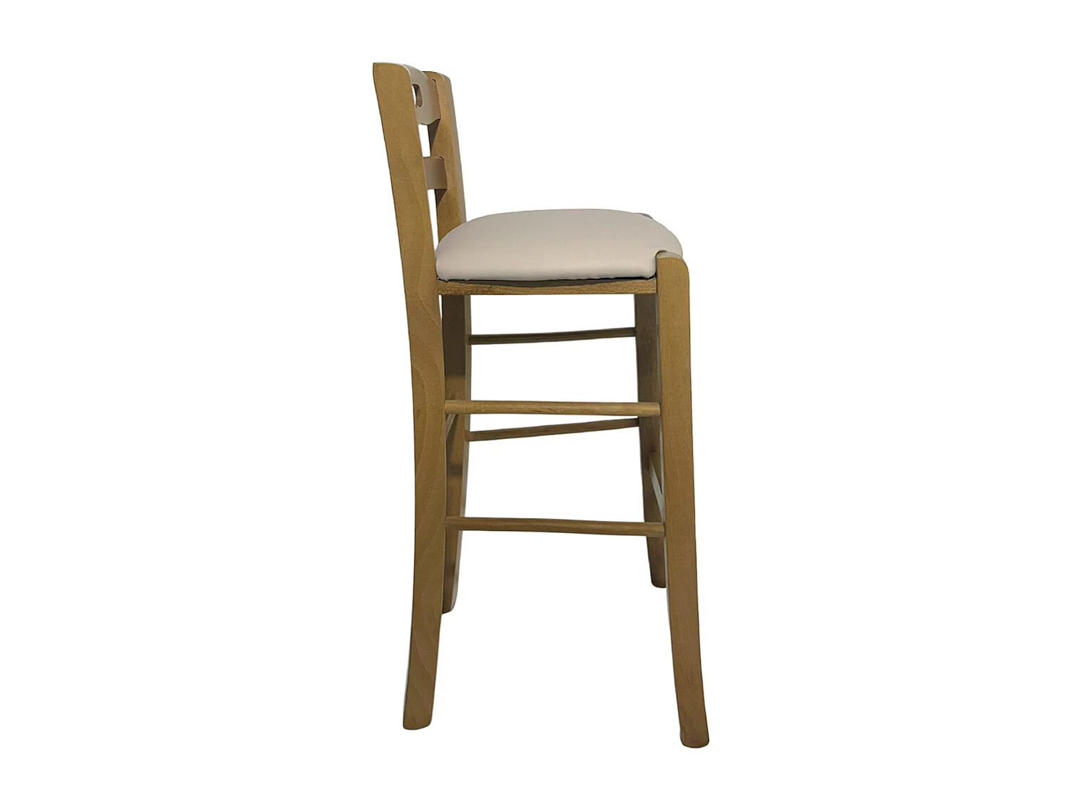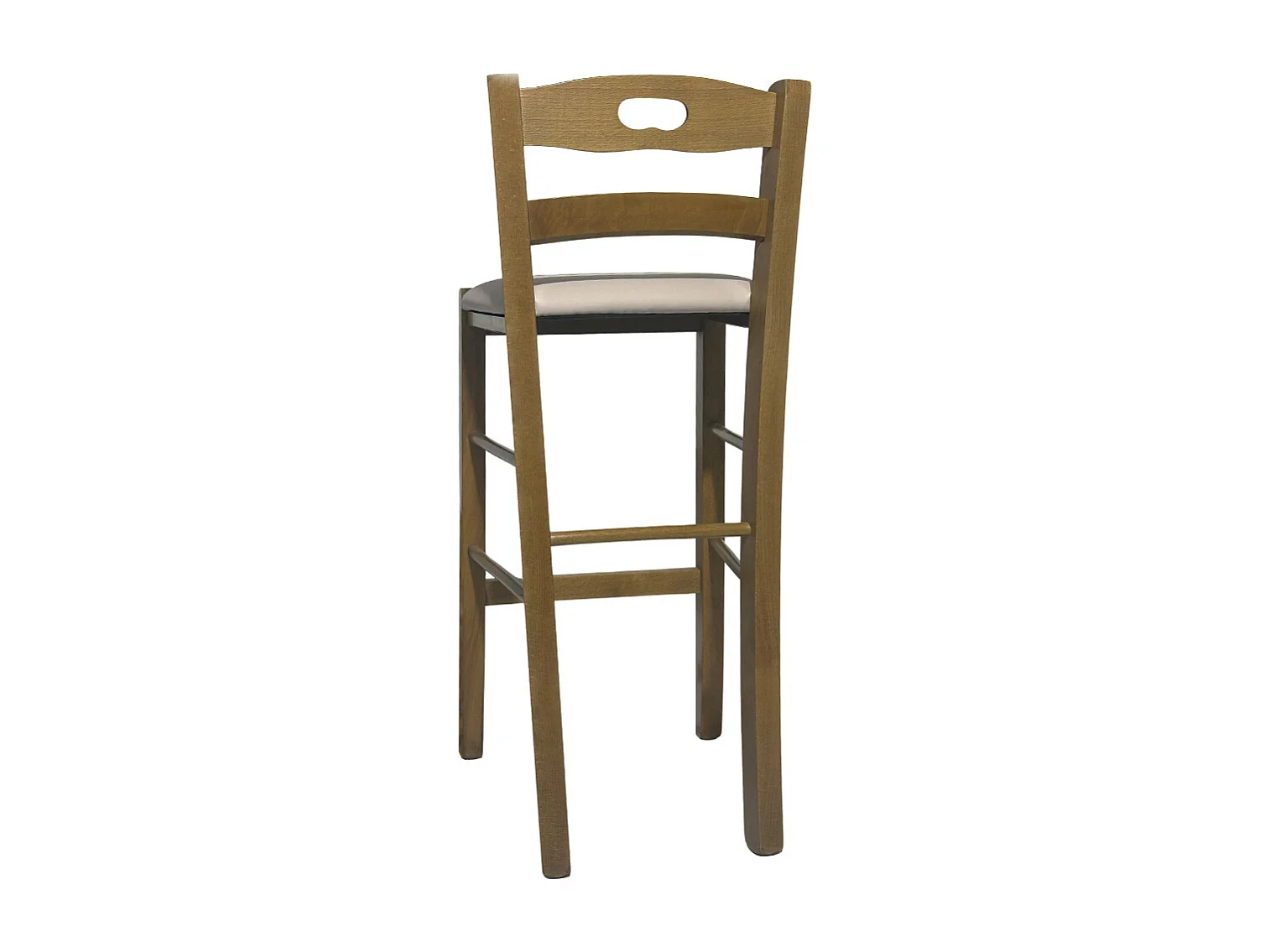 Taburete de madera de nogal claro con agujero en el respaldo h66 asiento ecopiel beige