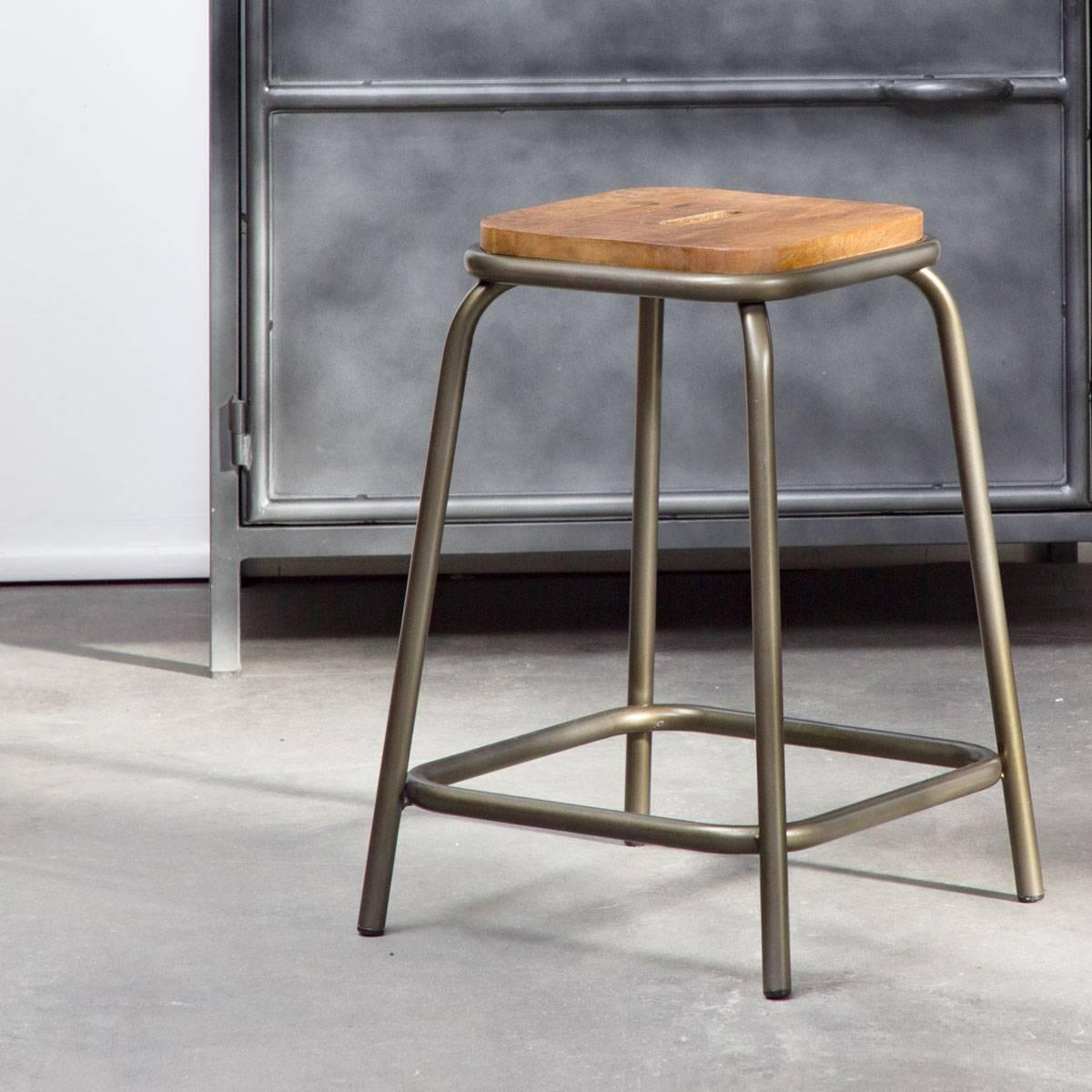 Taburete escolar vintage de metal y madera gris oscuro