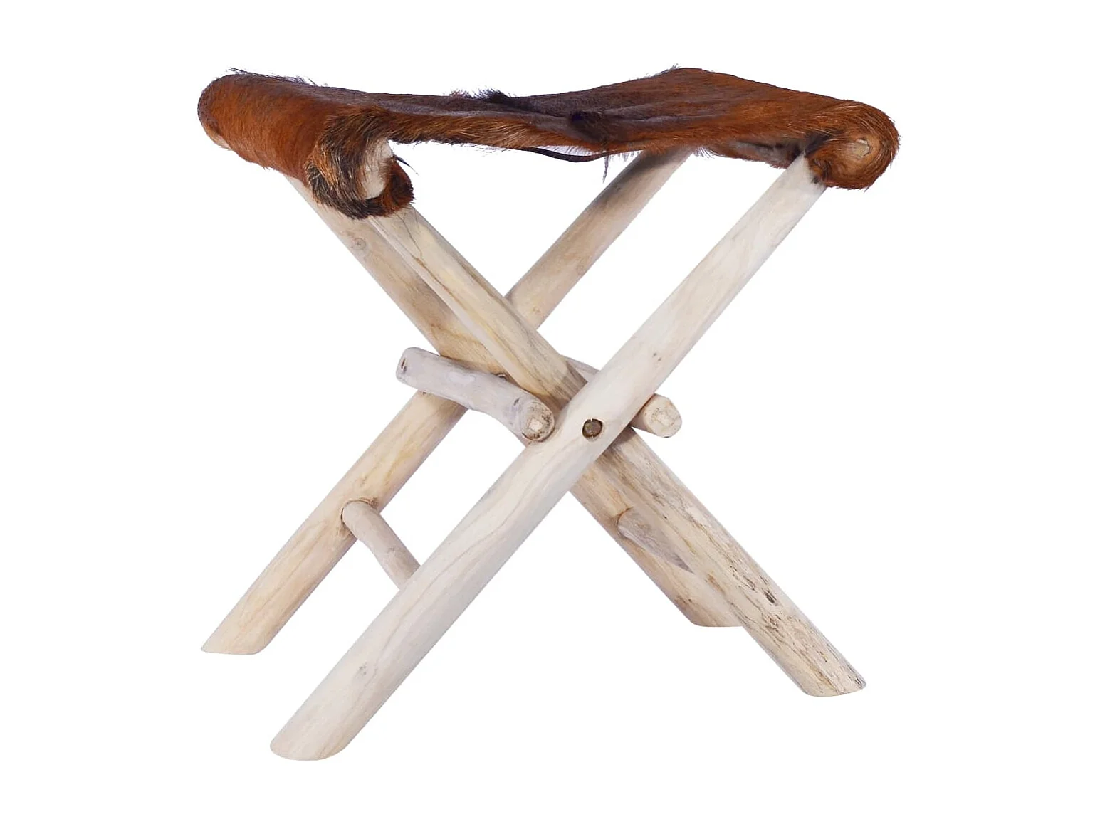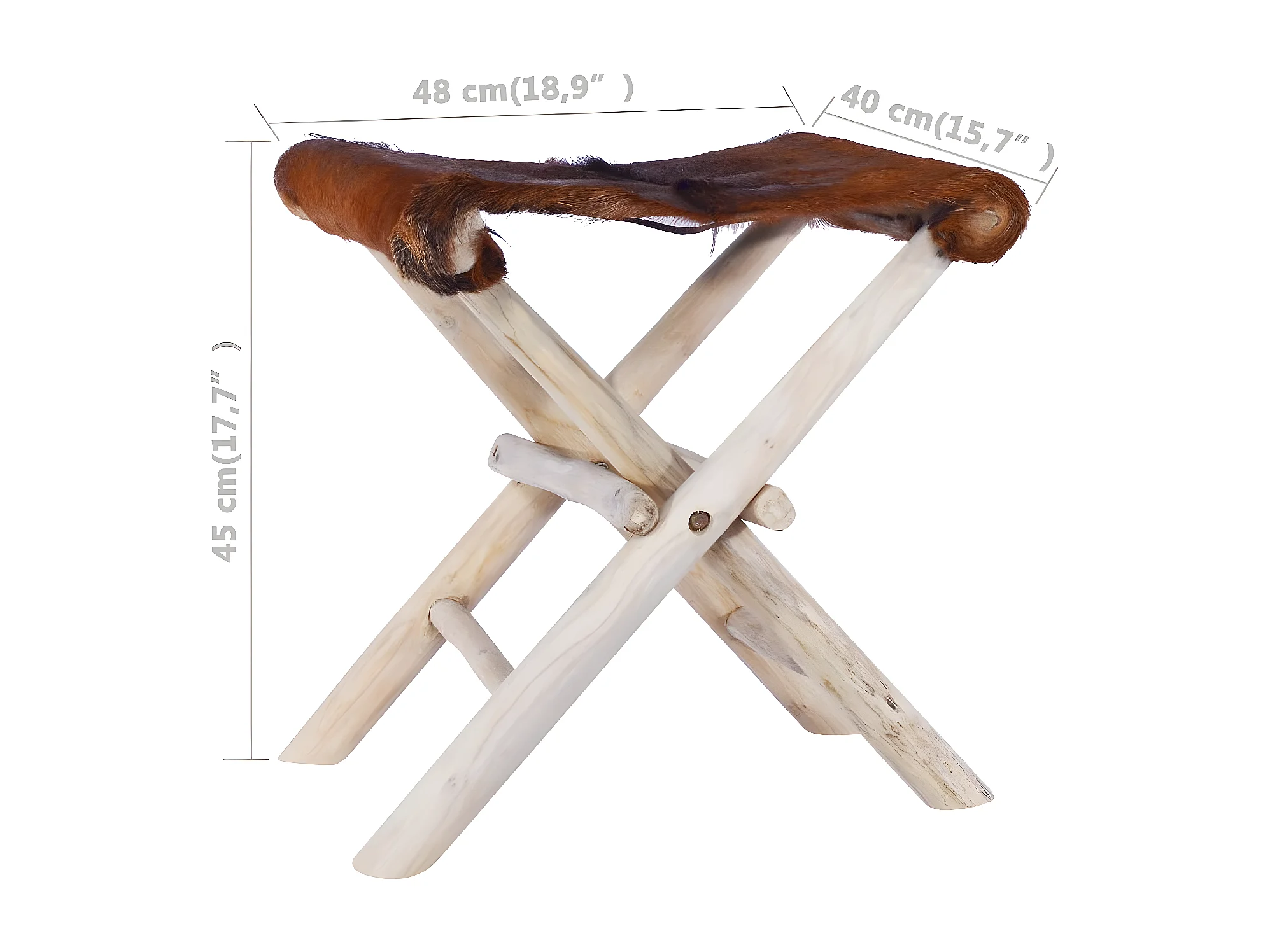 Taburete plegable de cuero auténtico y madera de teca maciza ES294481