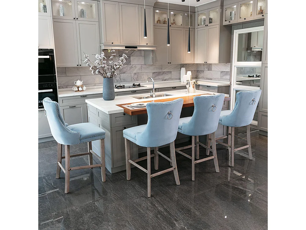 Taburetes de bar tapizados, juego de 2. Con remaches decorativos y patas de madera. Adornos cromados con remaches. Tapizado de terciopelo, azul claro.