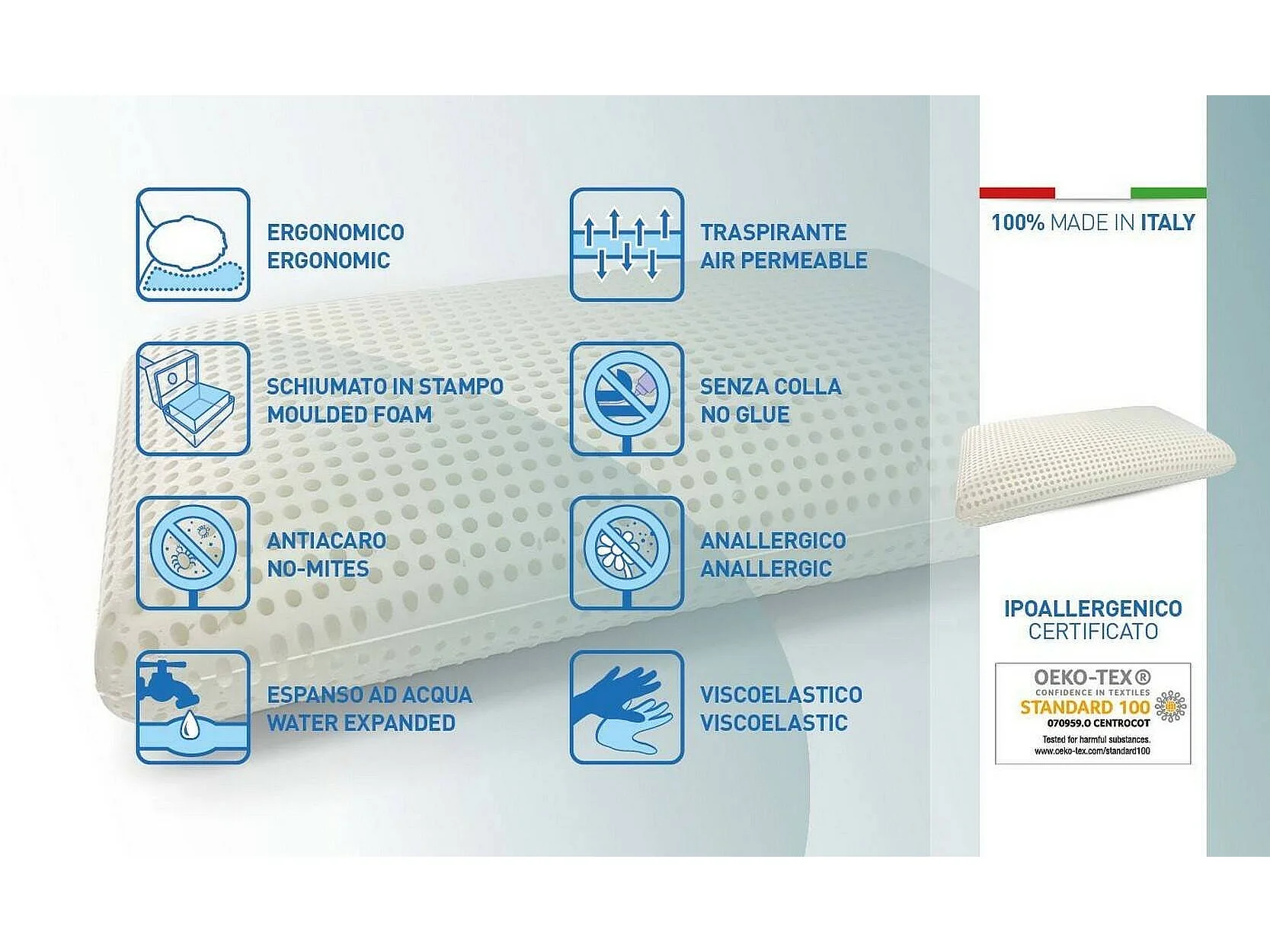 Talamo Italia Set of 2 Pillows for bed, 100% Made in Italy, Removable "soap" pillow in perforated Memory Foam, Hypoallergenic and Breathable, 70x40xh16 cm