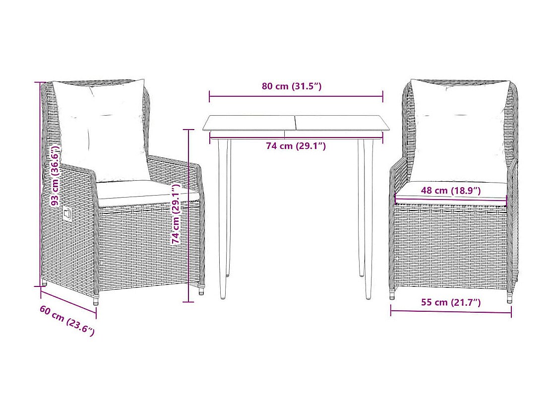 Wendral Set comedor de jardín 3 piezas con cojines ratán sintético gris
