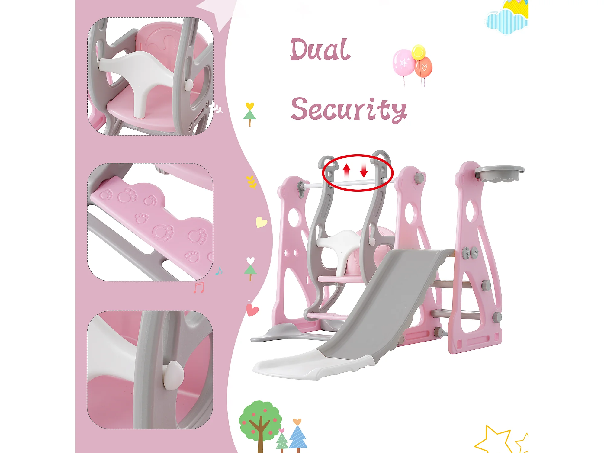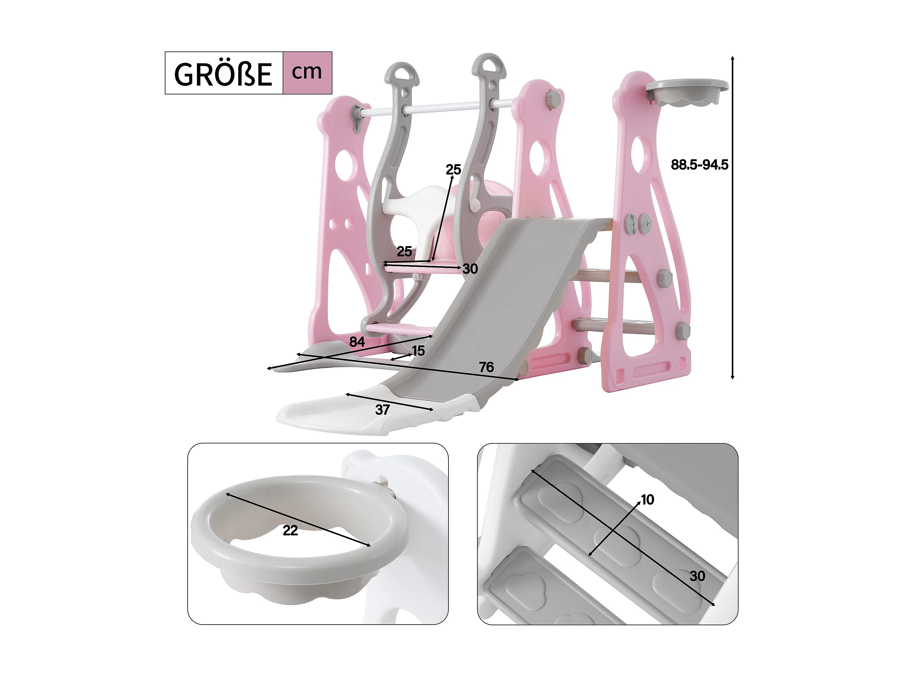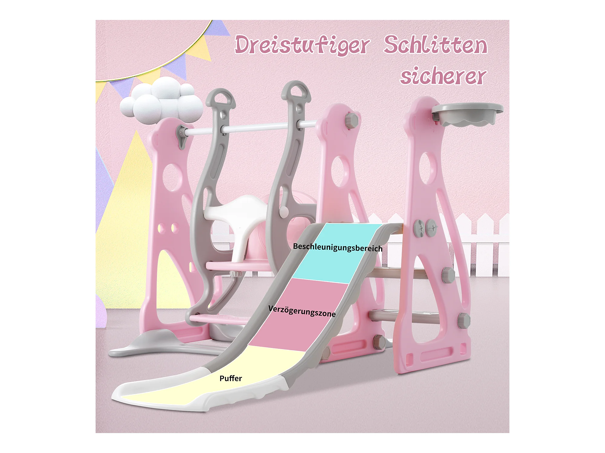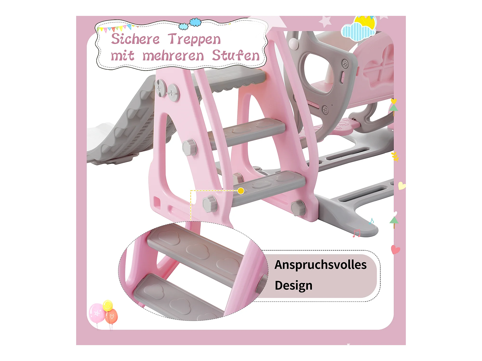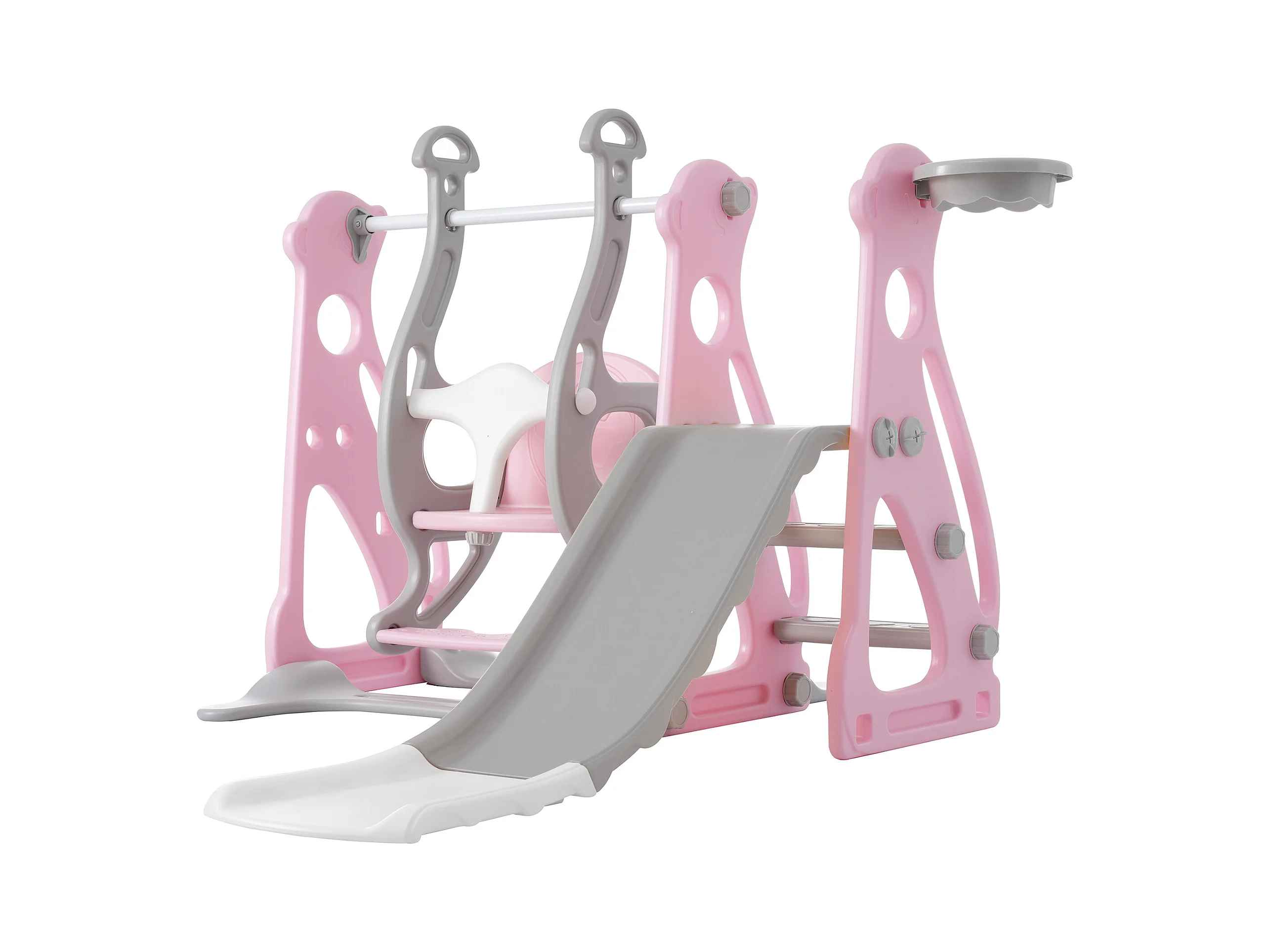 Tobogán infantil 4 en 1 - 113 x 100 x 94 cm - HDPE - Con escaleras y estructura de baloncesto - Rosa