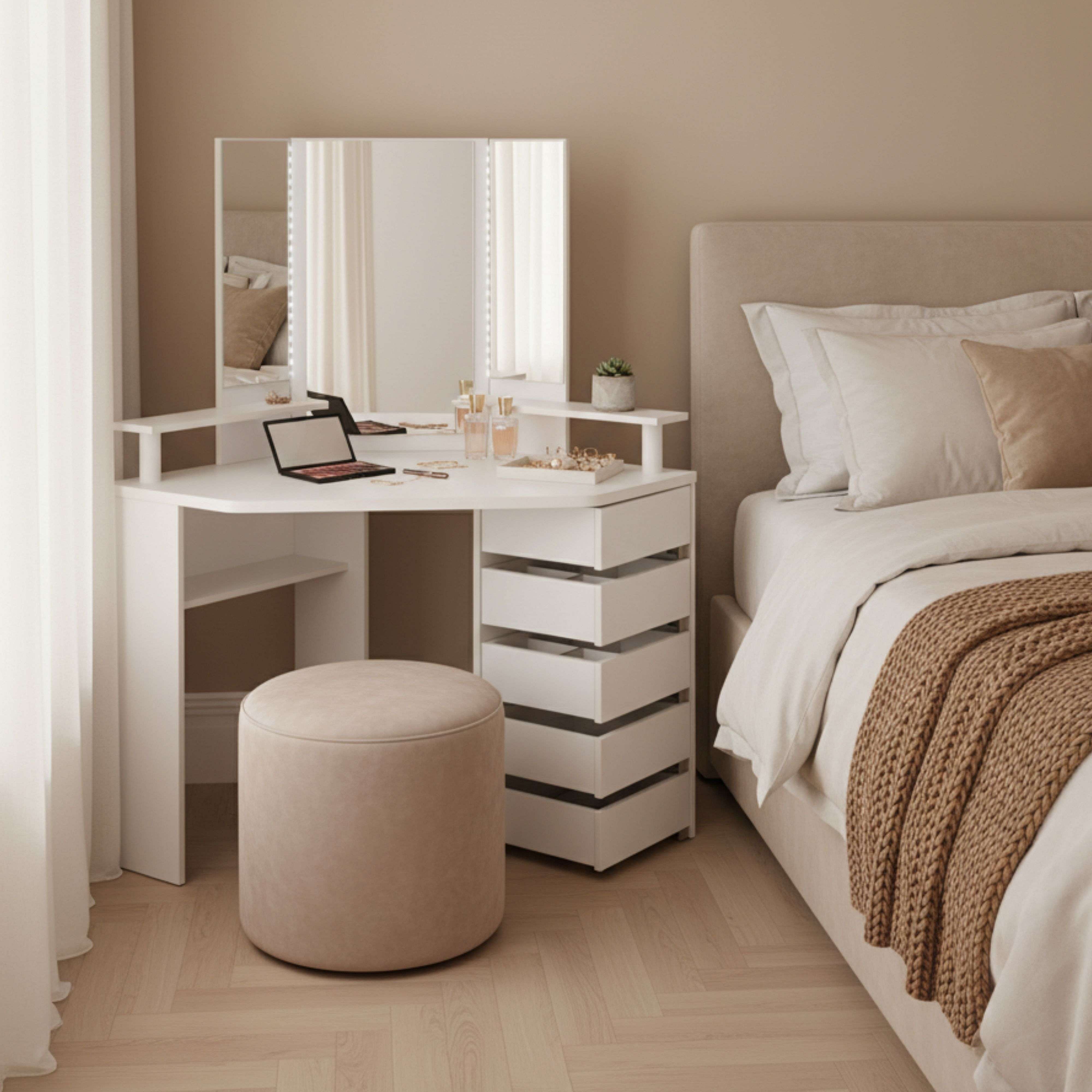 Juego de tocador con LED madera contrachapada blanco brillante
