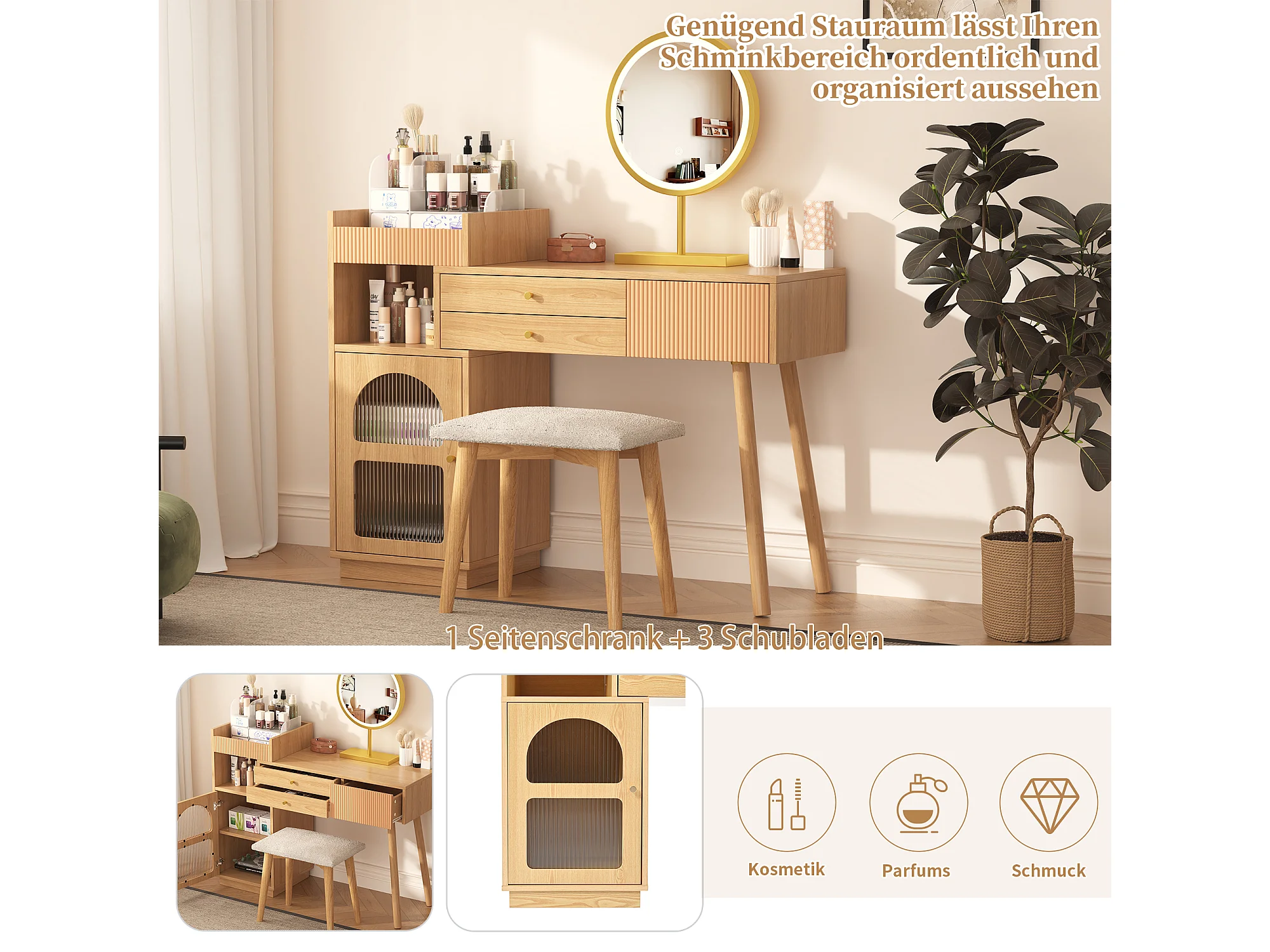Tocador con espejo LED con 3 cajones y mueble auxiliar - Tableros de partículas - Color natural