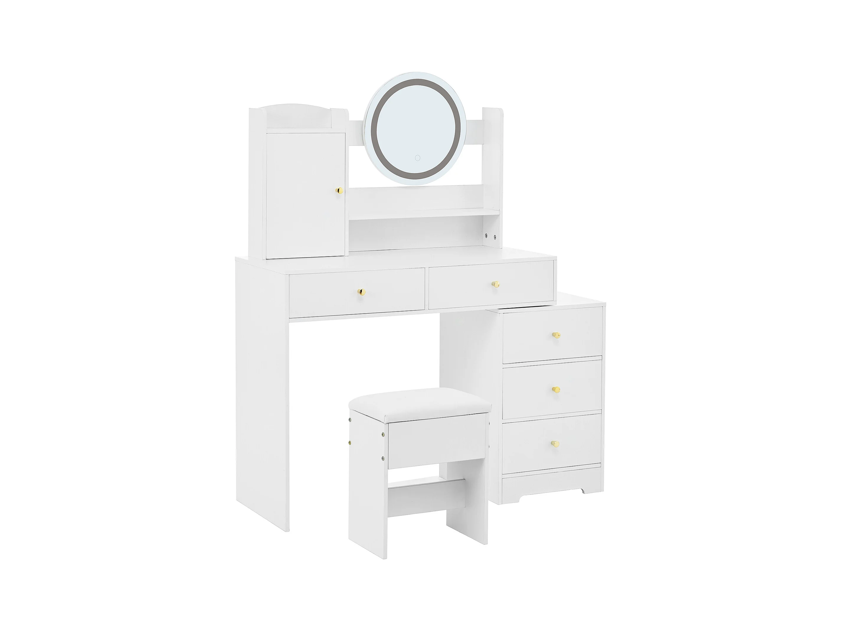 Tocador con LED - 90 x 40 x 132 cm - con 1 taburete + 5 cajones + 1 espejo + 1 puerta - MDF - blanco