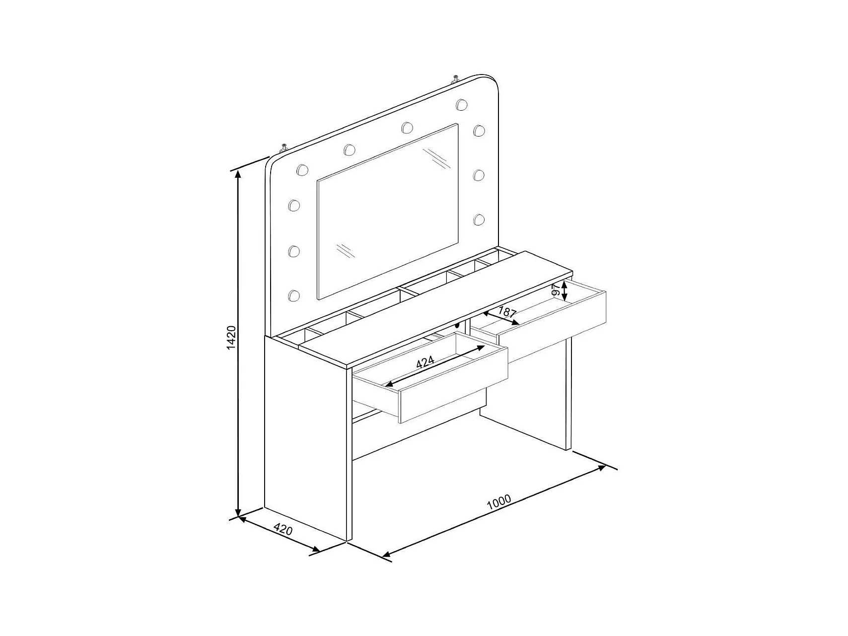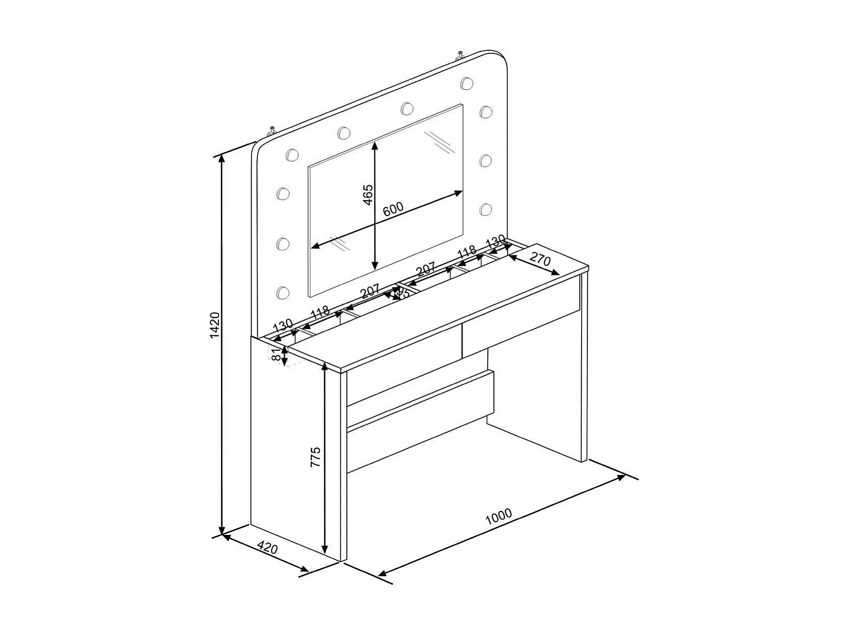 Tocador de maquillaje de 142x100x42 con espejo, 10 luces y almacenaje en blanco Holly
