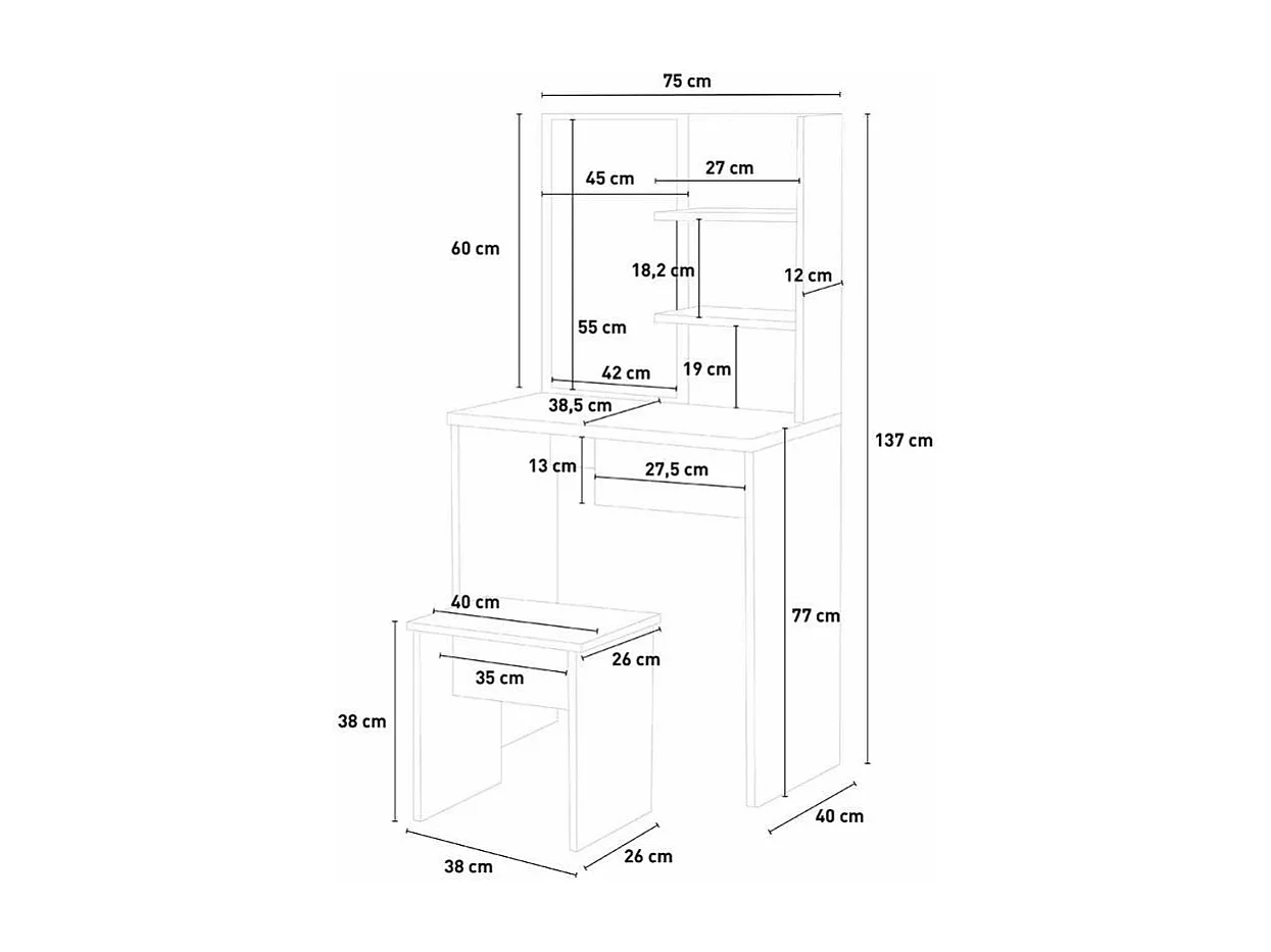 Consola de maquillaje con espejo, almacenamiento y taburete - L90 cm
