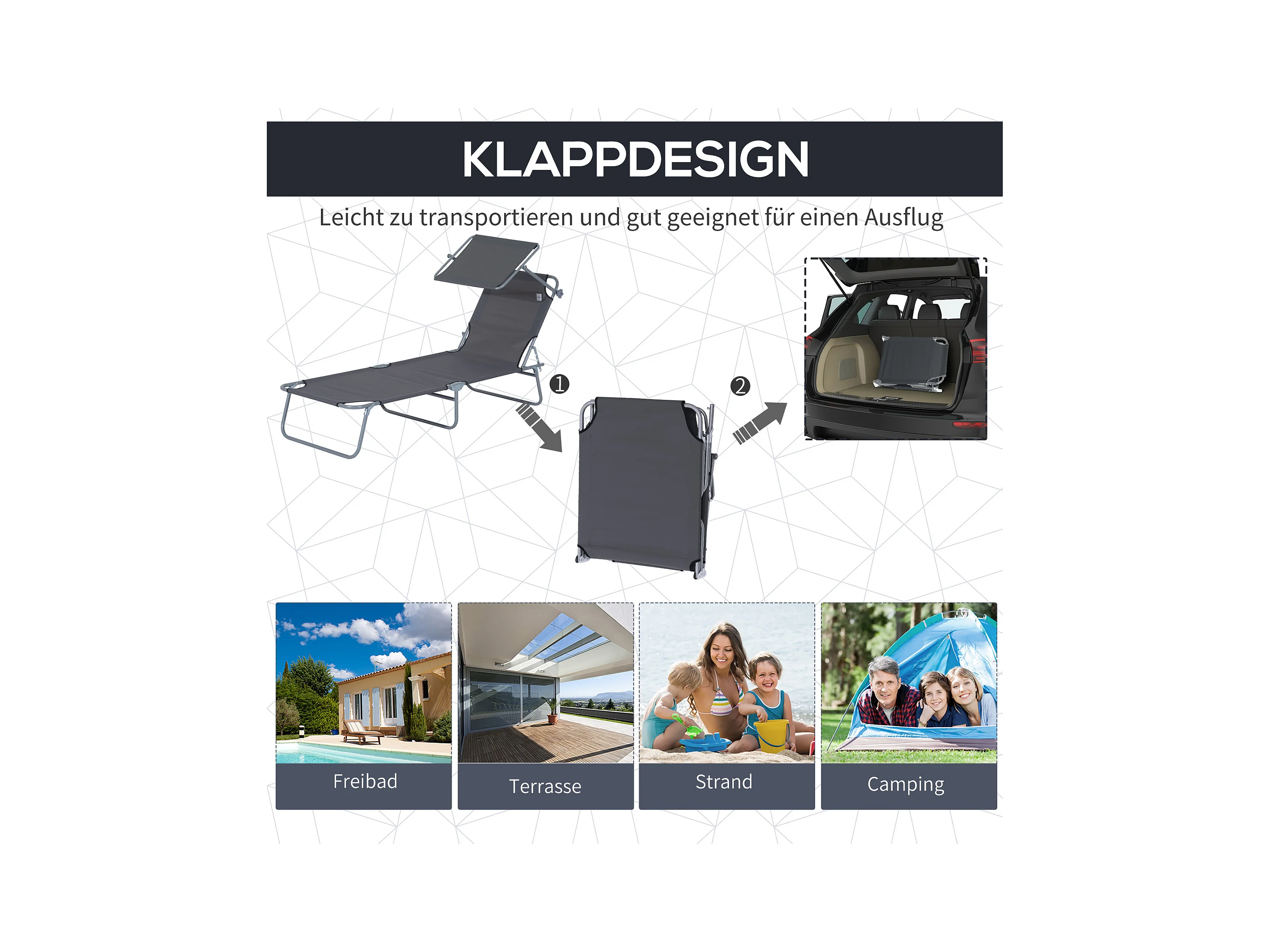 Tumbona plegable con parasol 187x58x36 cm, tumbona para jardín y playa, color gris
