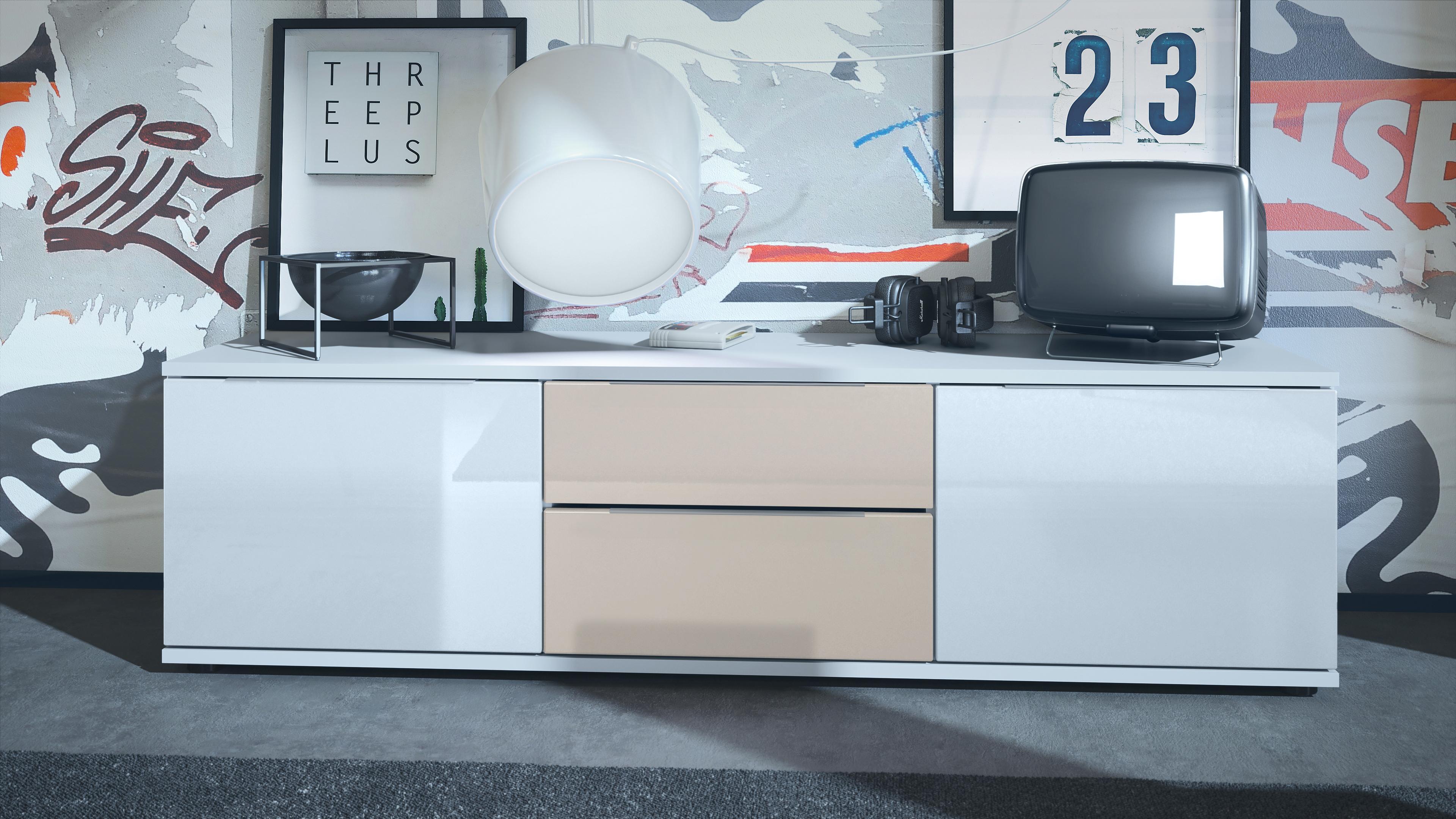 TV lowboard Linio V1, mesa TV con 2 puertas y 2 cajones - Blanco / gris arena de alto brillo (138,5 x 37,5 x 35 cm)