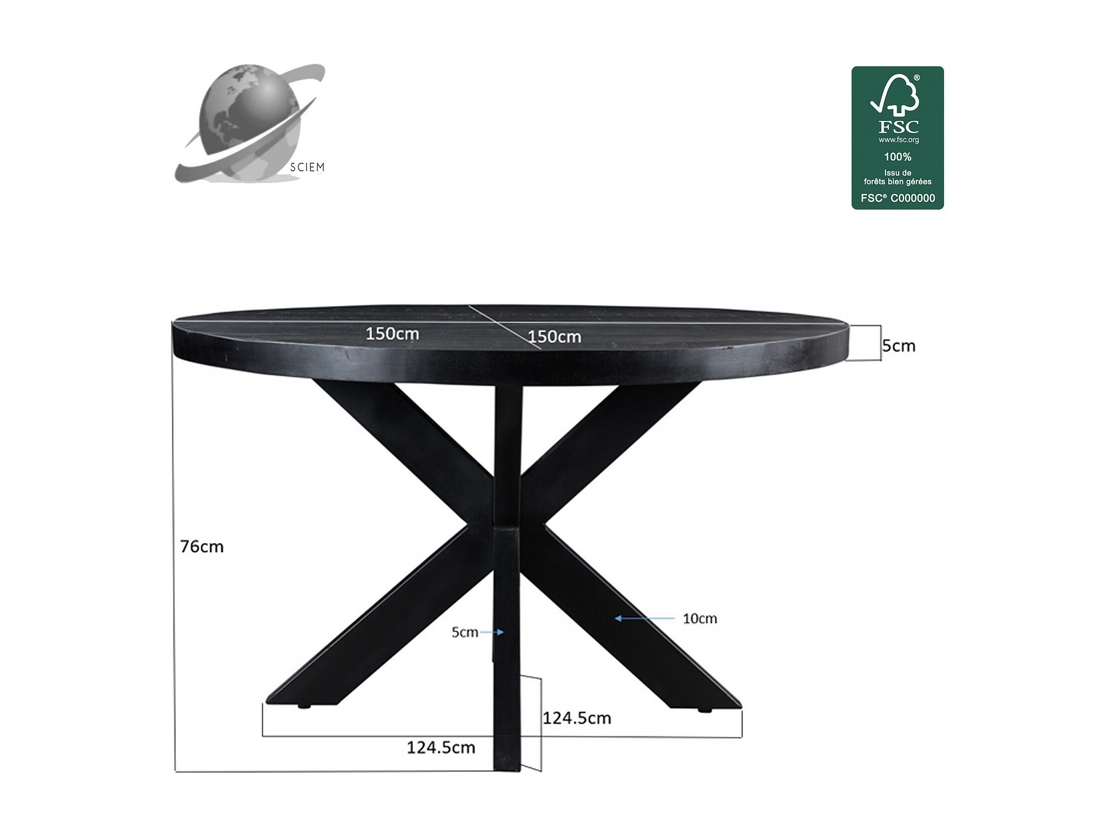 UZES-Mesa de comedor redonda 6 personas 150 cm madera negra