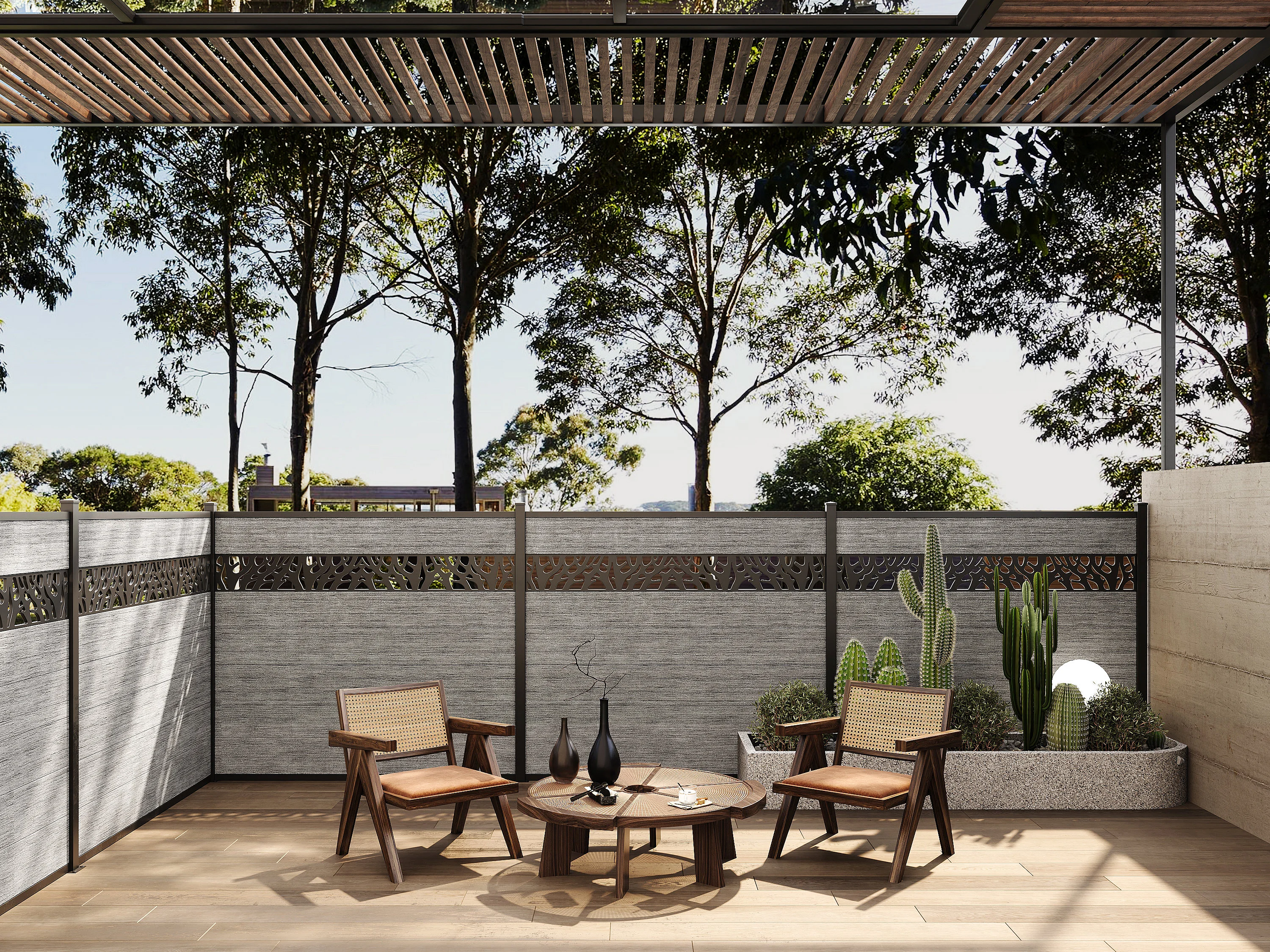 Valla de láminas Alt.181 cm - kit 7 láminas composite decoradas + 2 postes gris claro - ENOLA