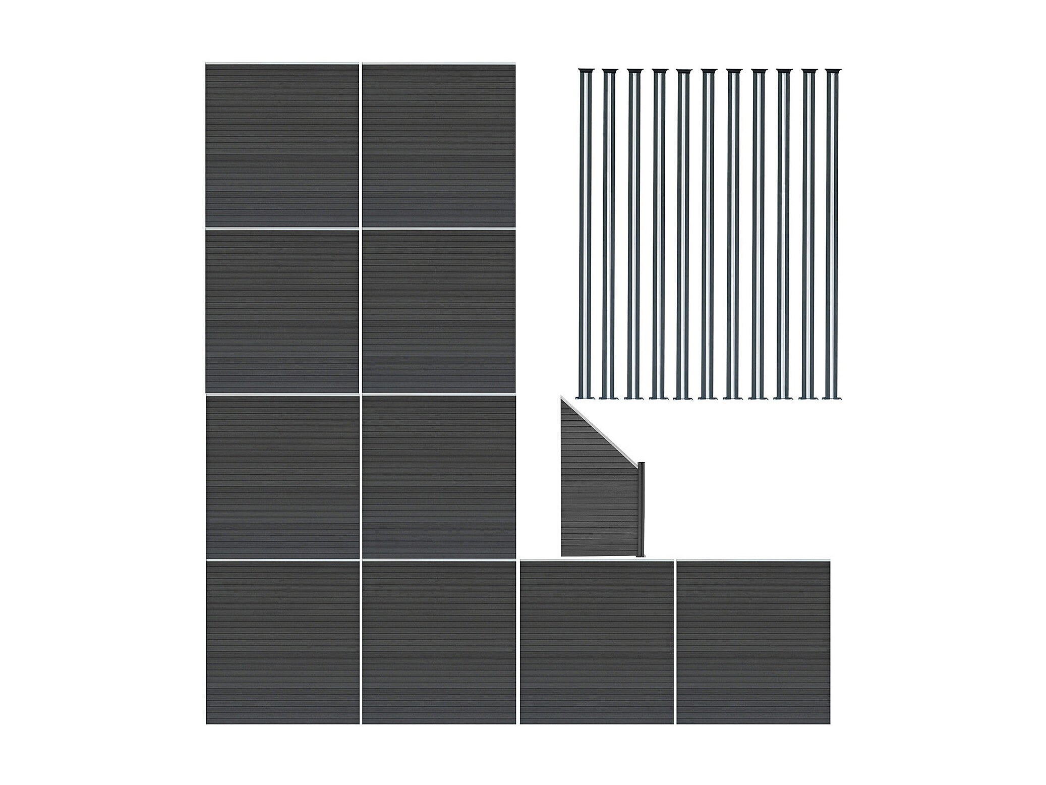 Vallas para exteriores de WPC y Aluminio - 10xPaneles Cuadrados + 1x Oblicuo + 11x Postes con LED | Gris