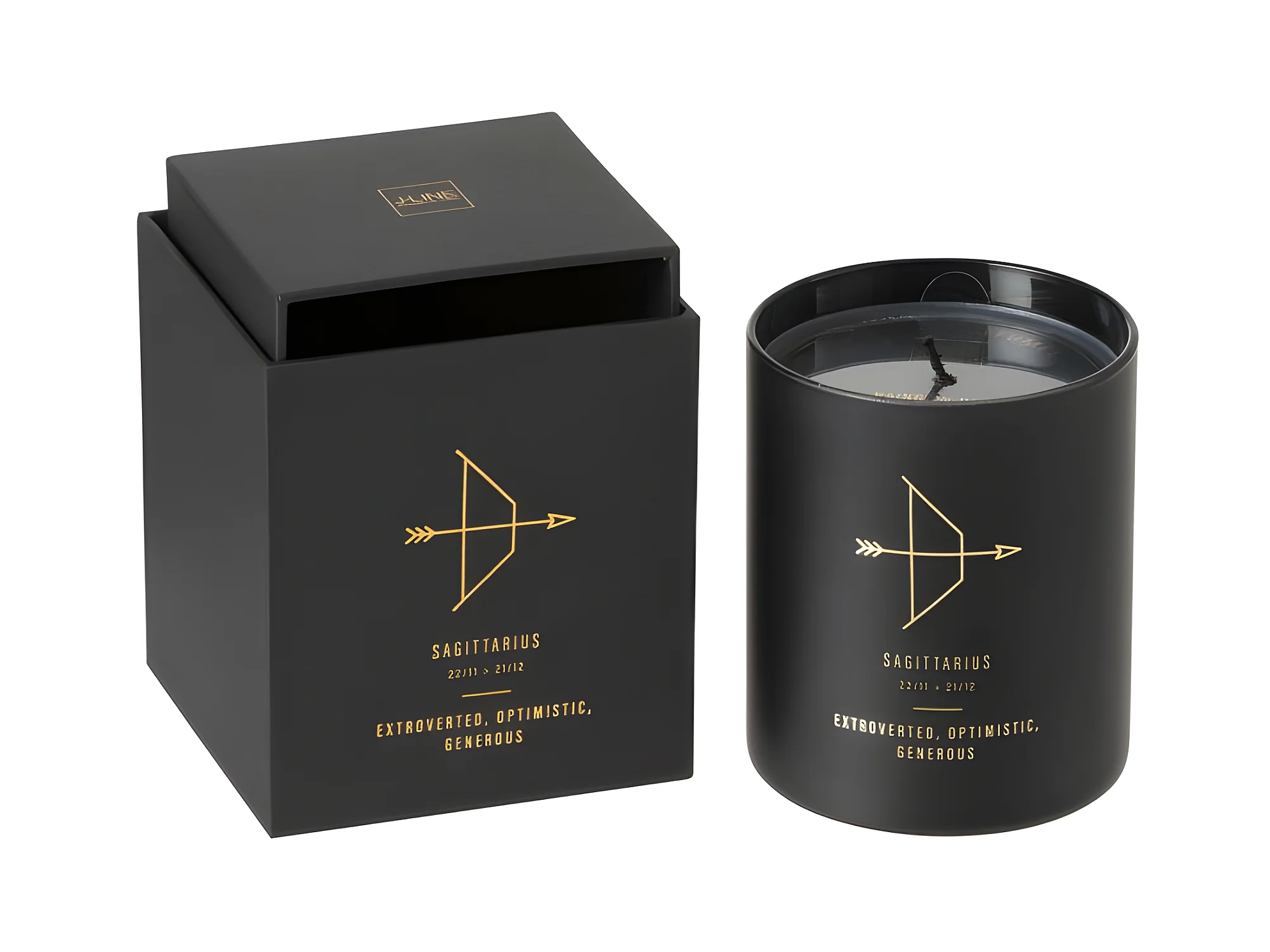 Vela perfumada signo sagitario 50H en tarro de vidrio negro 8x8x9.5 cm
