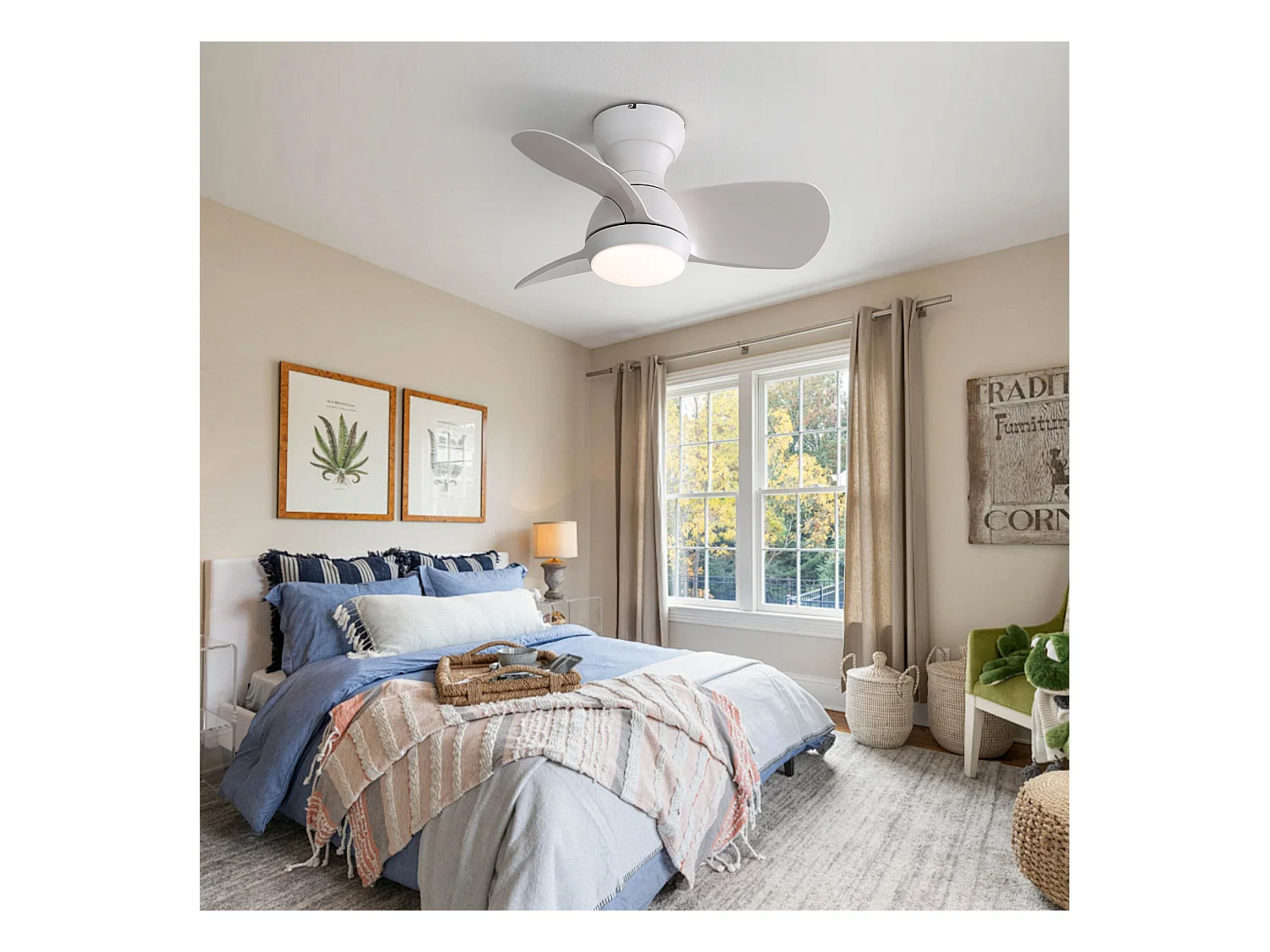 Ventilador de techo blanco con control remoto de 6 velocidades y aspas de ABS para dormitorio y sala de estar.