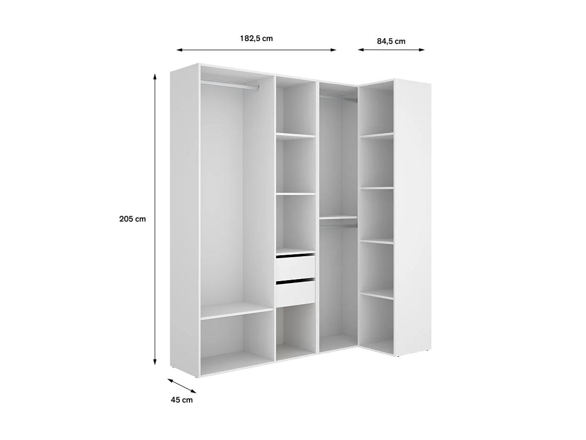 Vestidor de rincón Reus con estantes, 2 cajones y trasera reversible en blanco/natural, 2