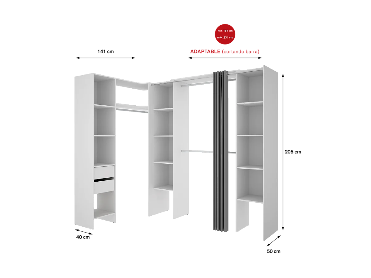Vestidor de rincón Siles con cortina y cajones acabado blanco, 205cm(alto) 234cm(ancho) 1