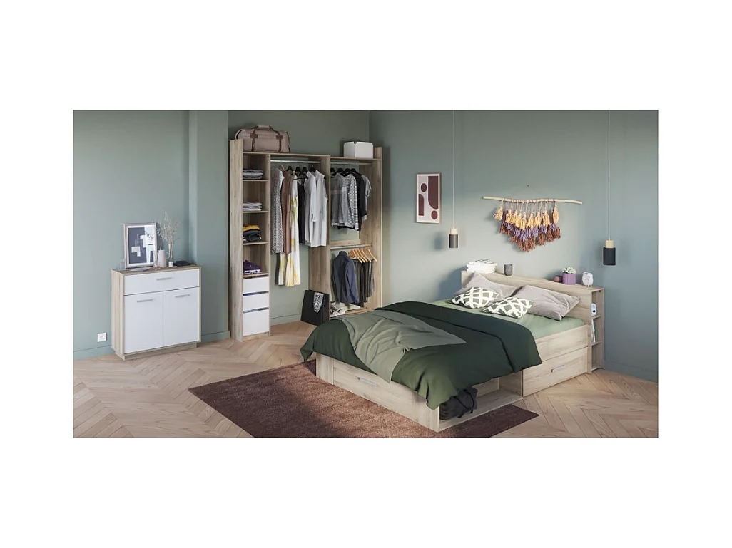 Dormitorio blanco madera clara: Armario + Cómoda 2 cajones + Estantería