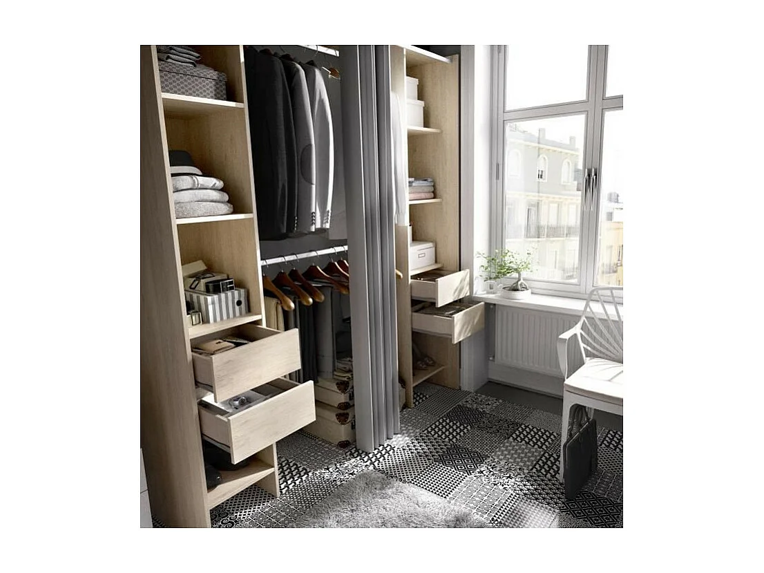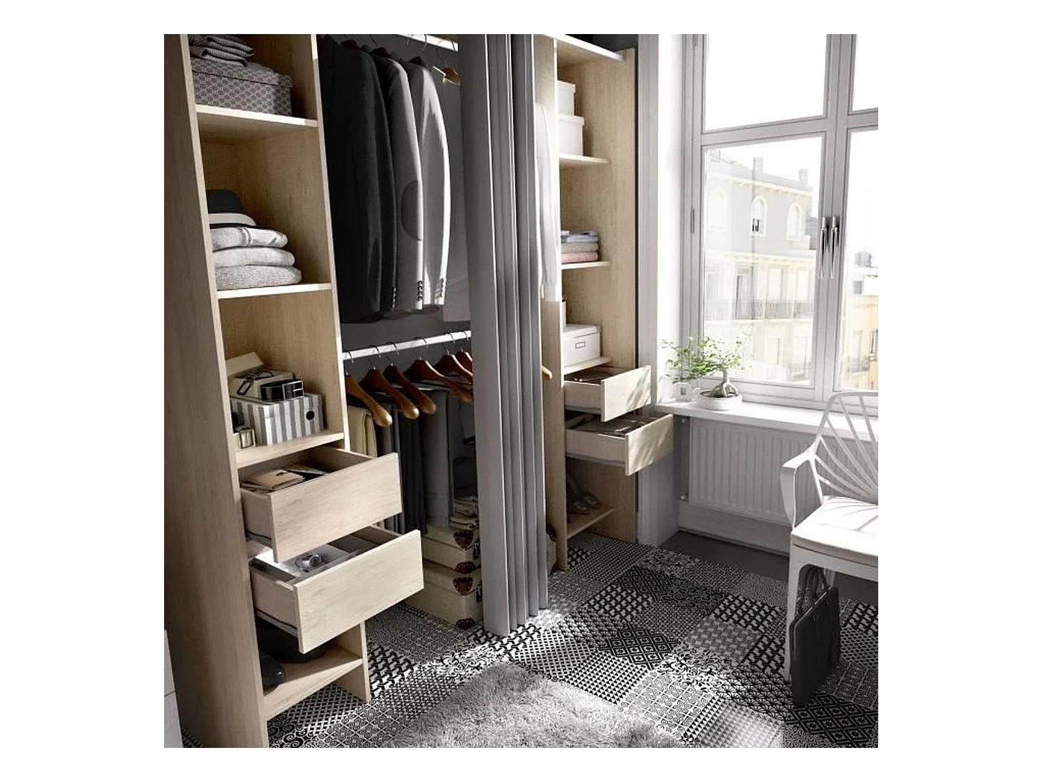 Vestidor extensible con cortina + 4 cajones - Decoración roble natural 180-113 x 50 x Alto 205 cm
