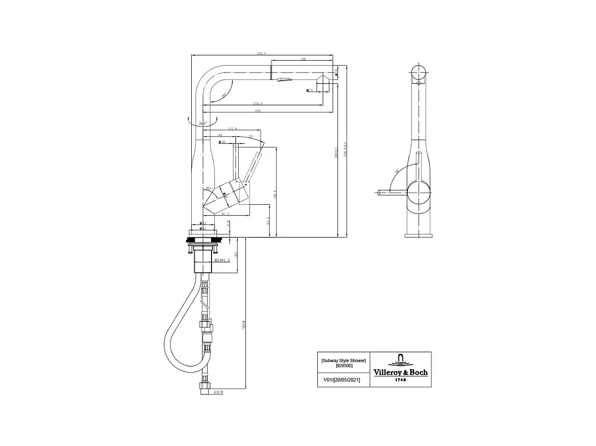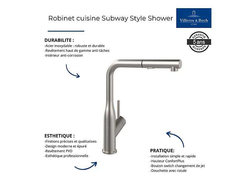VILLEROY ET BOCH Grifo de cocina para ducha estilo Subway de acero macizo