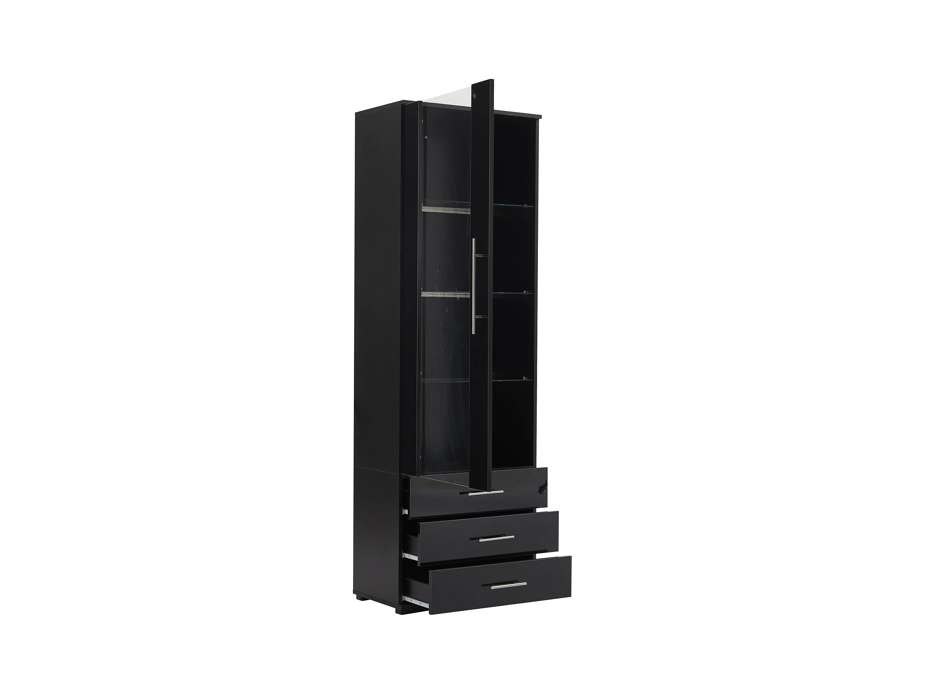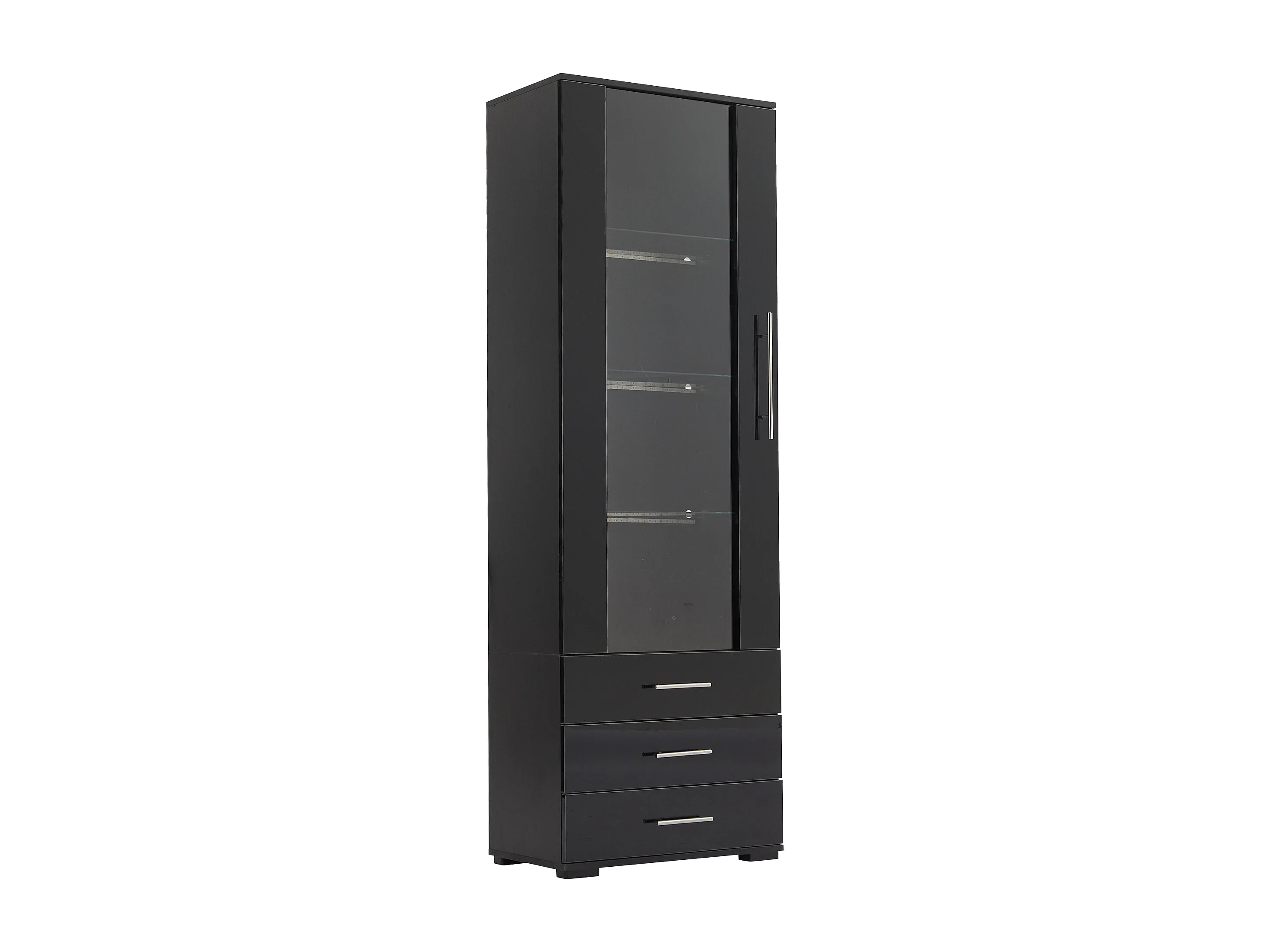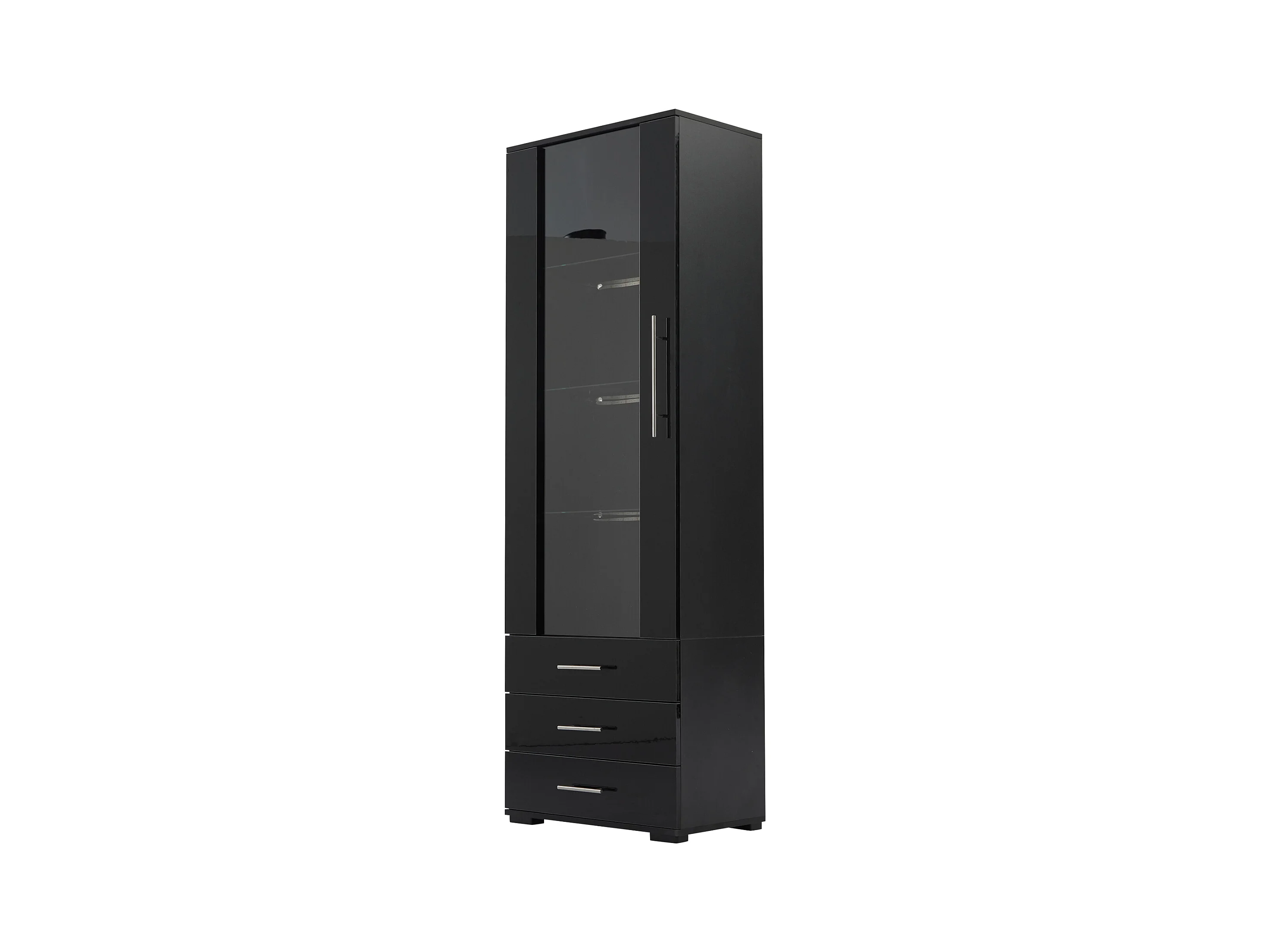 Vitrina alta con 3 cajones y 1 puerta de cristal, cuerpo de MDF lacado en negro, LED incluido - 60x35x180cm