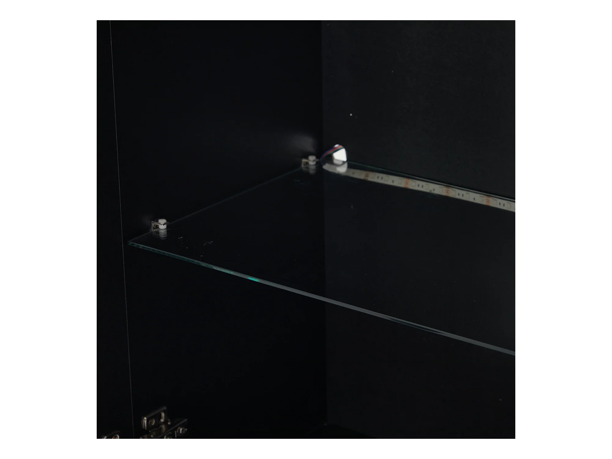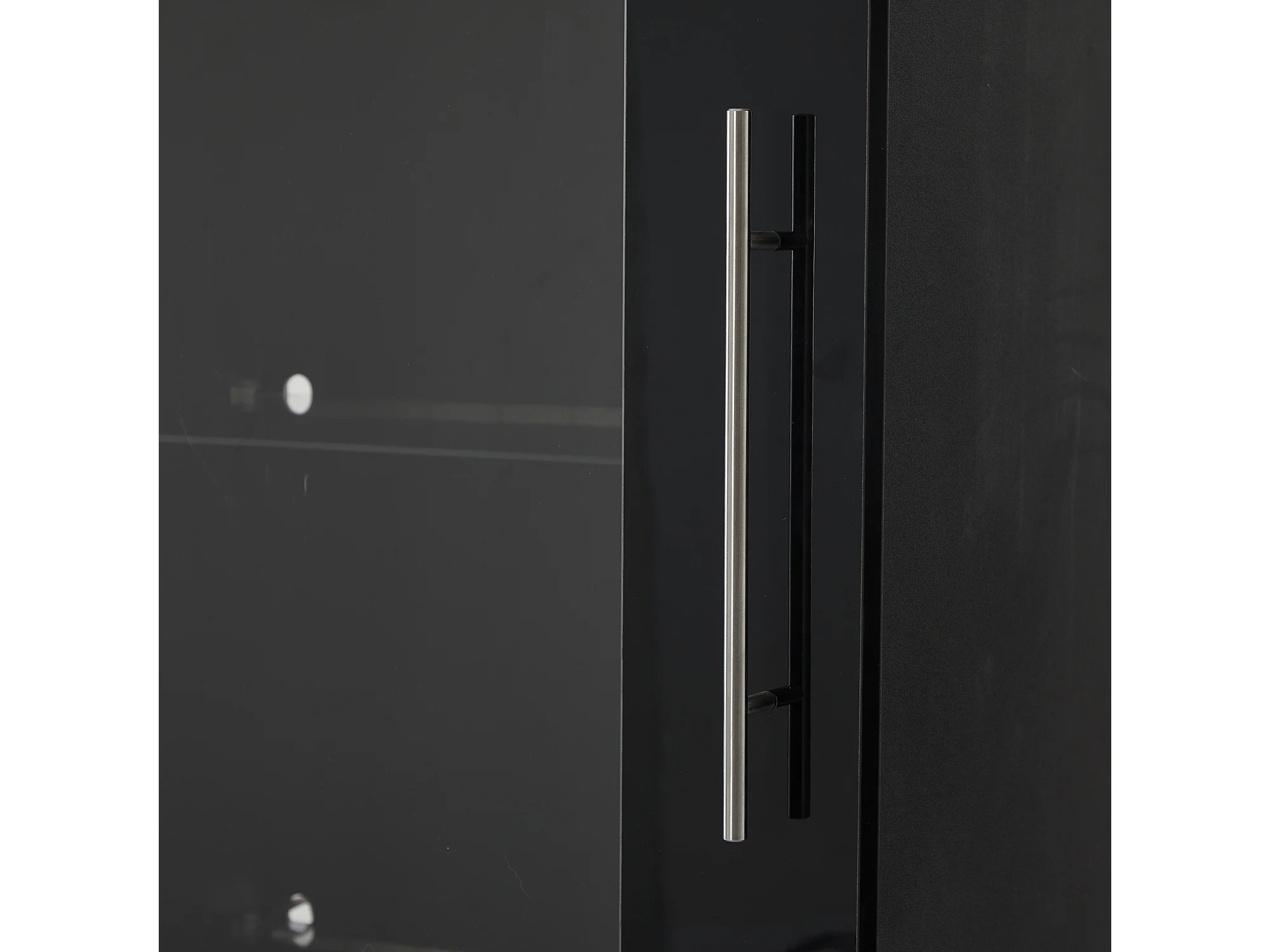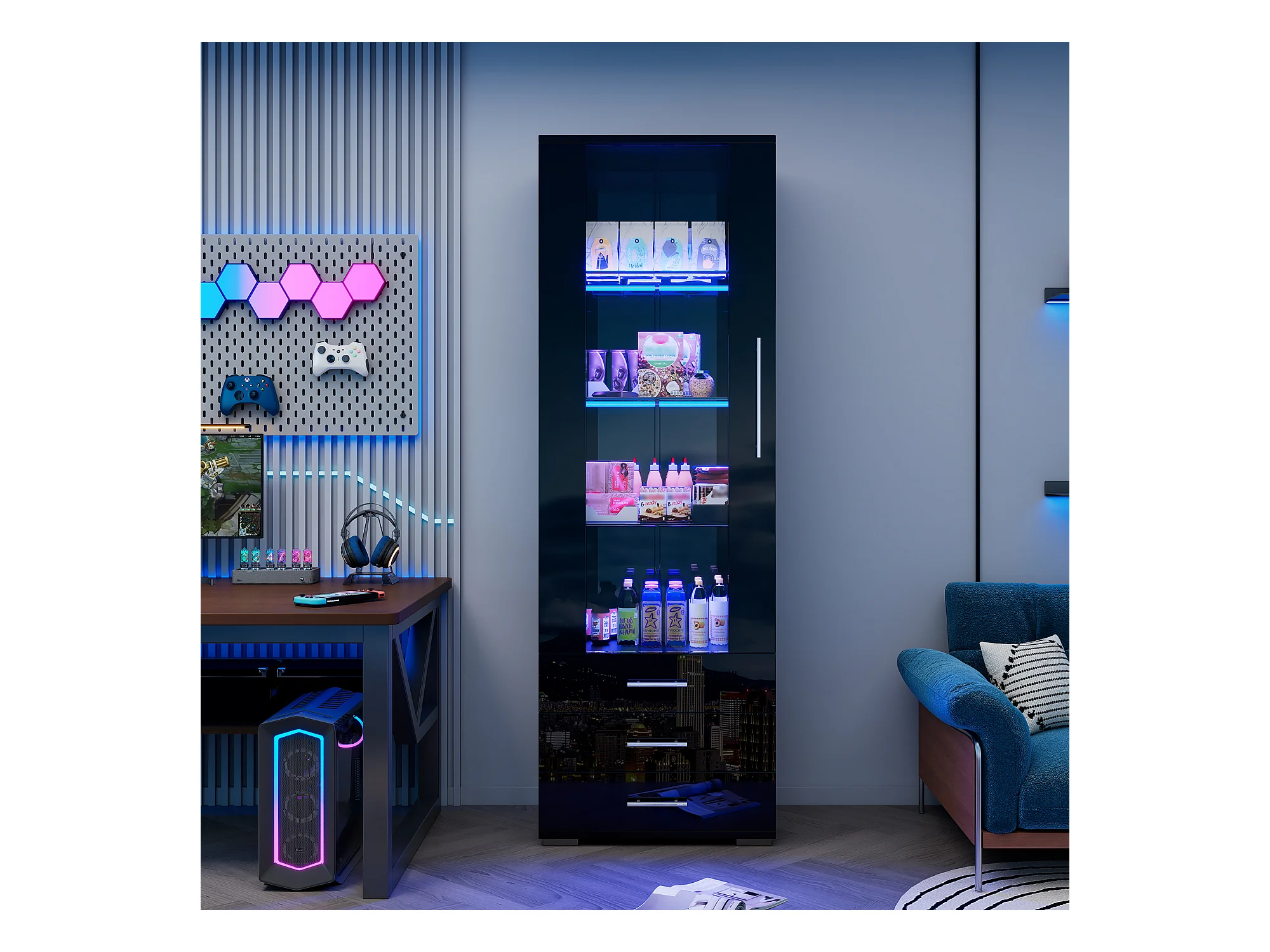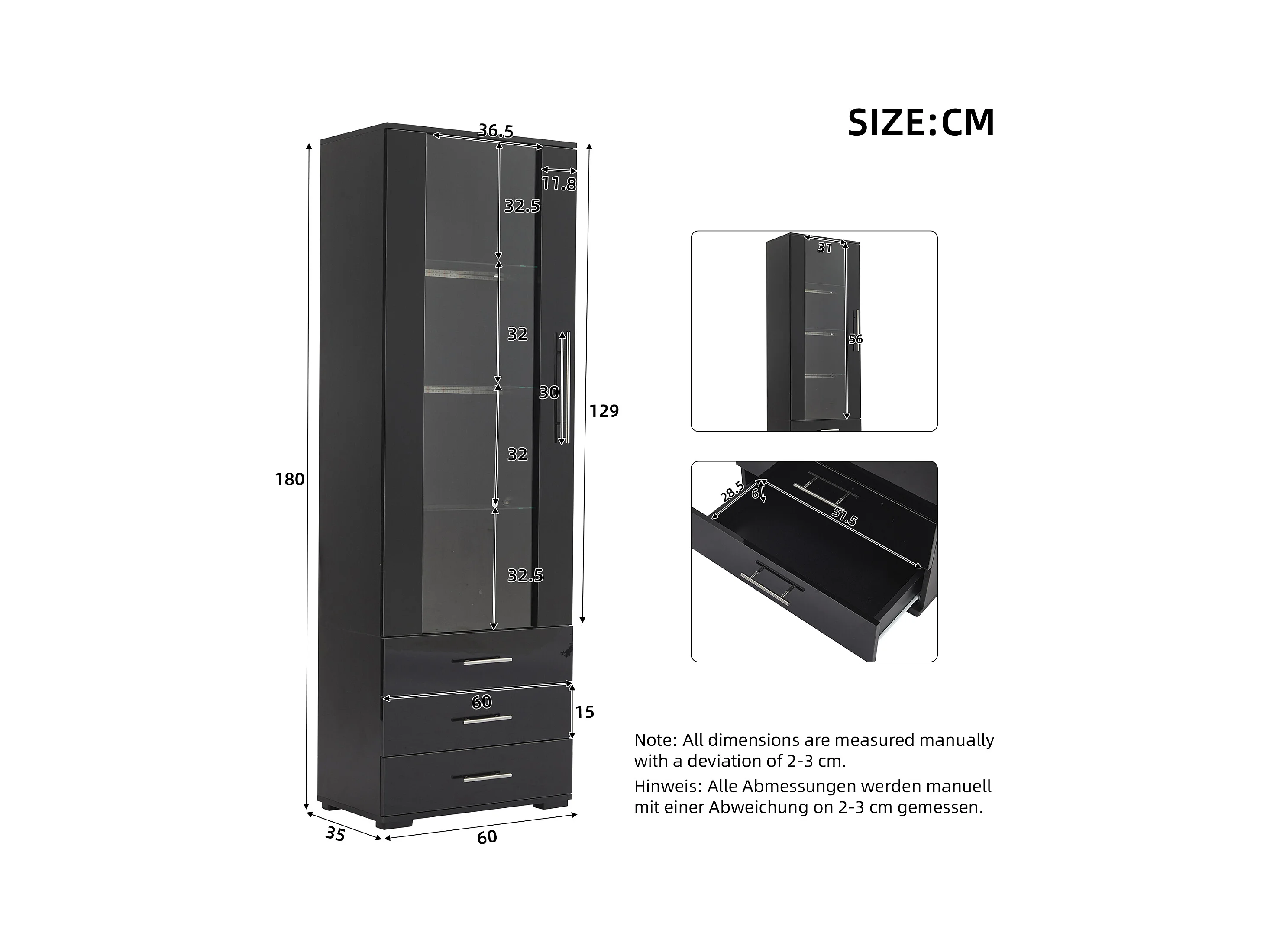 Vitrina alta con 3 cajones y 1 puerta de cristal, cuerpo de MDF lacado en negro, LED incluido - 60x35x180cm